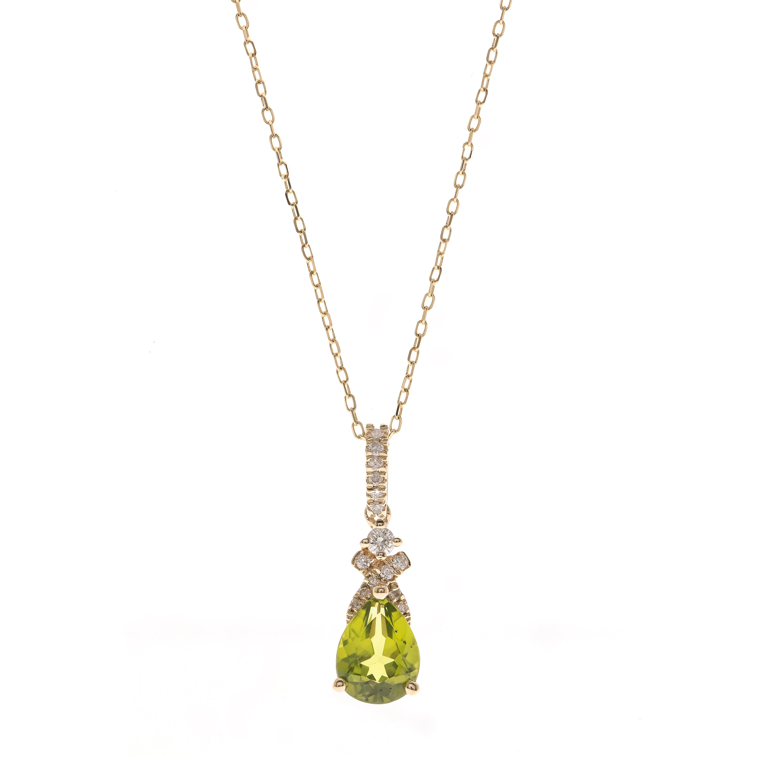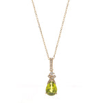 Decorate yourself in elegance with this Pendant is crafted from 14-karat Yellow Gold by Gin & Grace. This Pendant is made up of 6*8 mm Pear-Cut Manchurian Peridot (1 pcs) 1.31 carat and Round-cut White Diamond (17 Pcs) 0.12 Carat. This Pendant is weight 1.76 grams. This delicate Pendant is polished to a high finish shine.