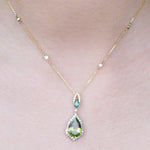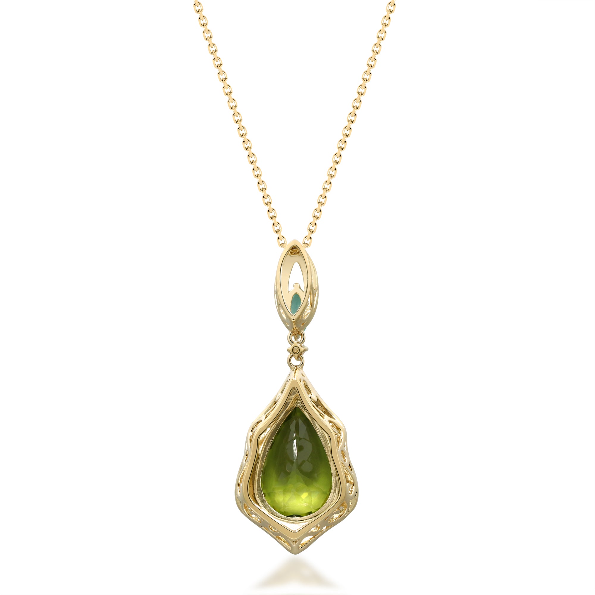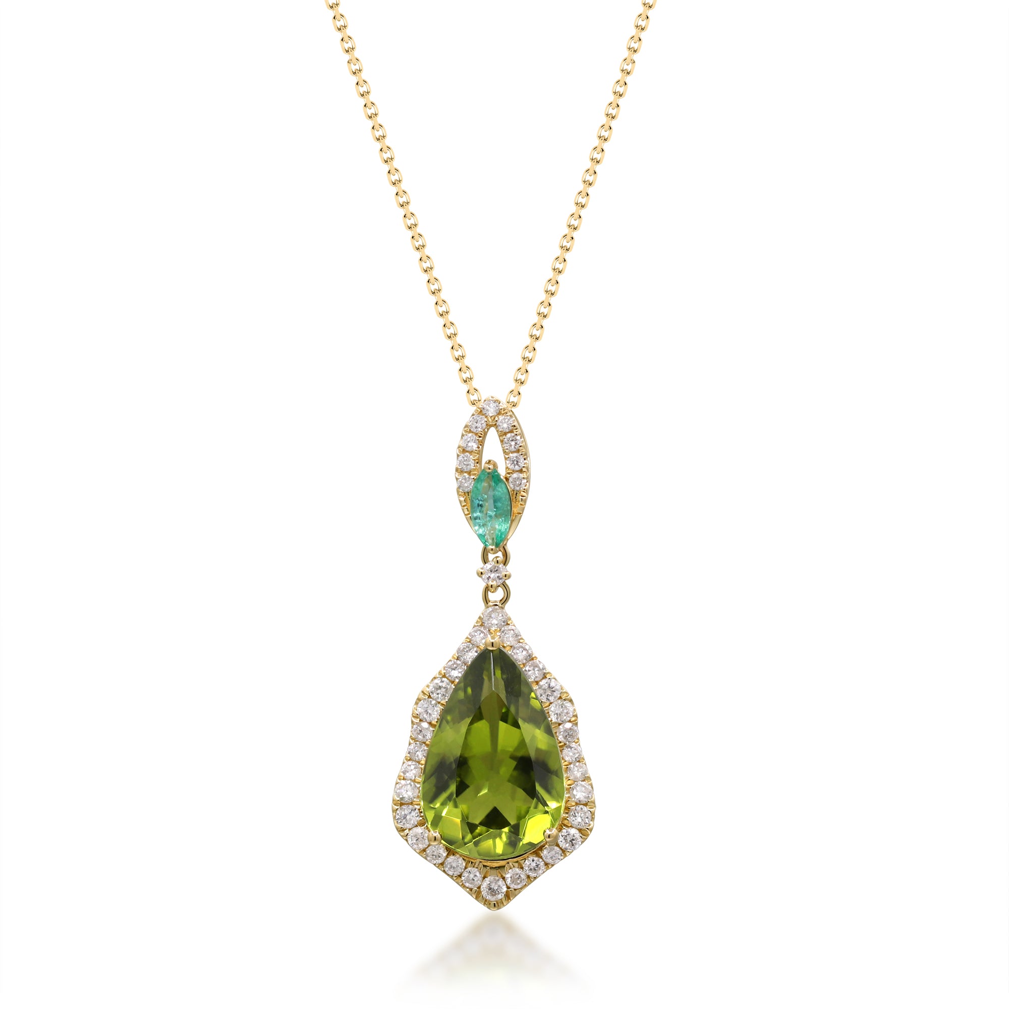 Decorate yourself in elegance with this Pendant is crafted from 14-karat Yellow Gold by Gin & Grace. This Pendant is made up of Pear-cut Manchurian Peridot (1 pcs) 3.87 carat, Marquise-cut Emerald (1 pcs) 0.20 carat and round-cut White Diamond (40 Pcs) 0.56 Carat. This Pendant is weight 4.44 grams. This delicate Pendant is polished to a high finish shine.