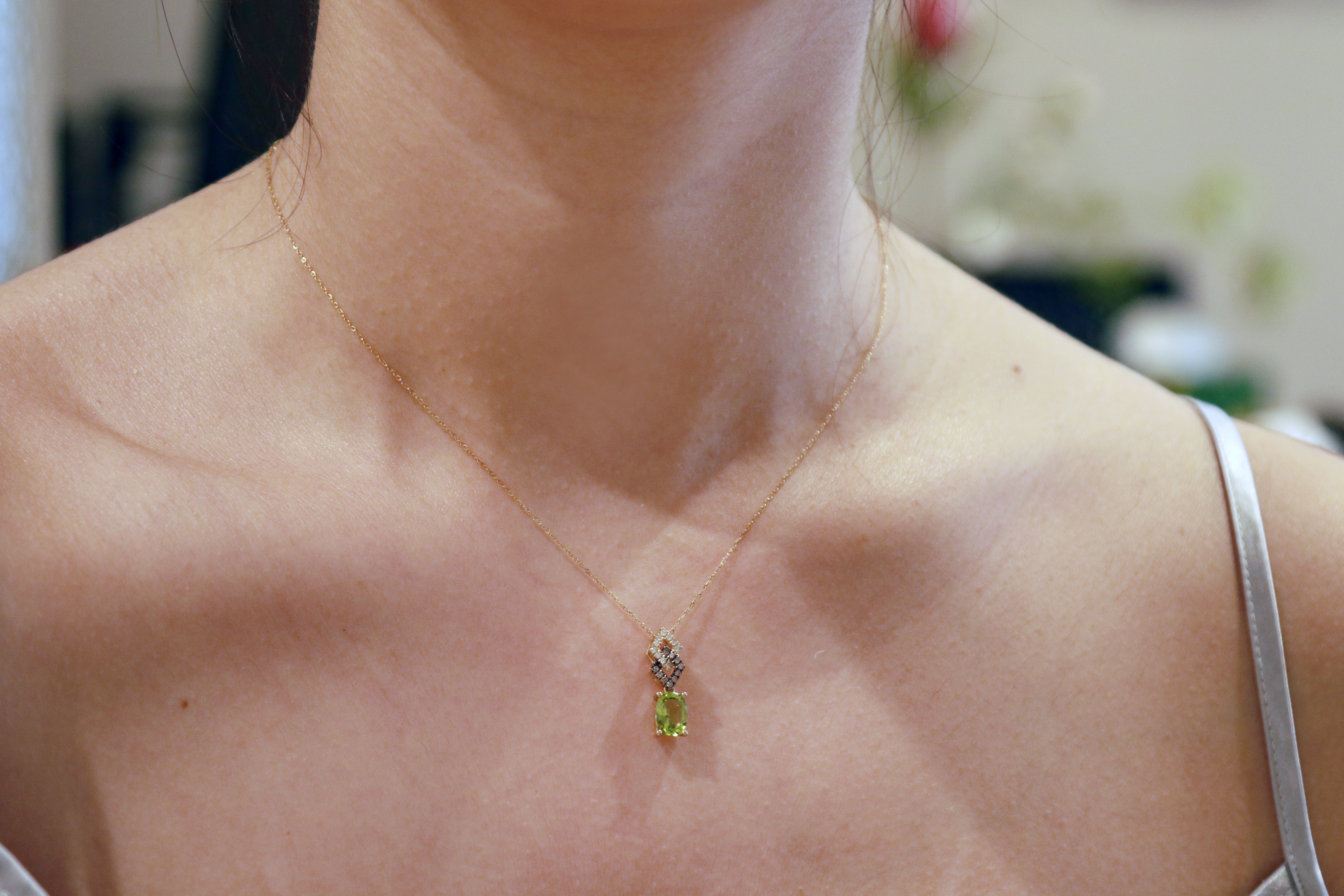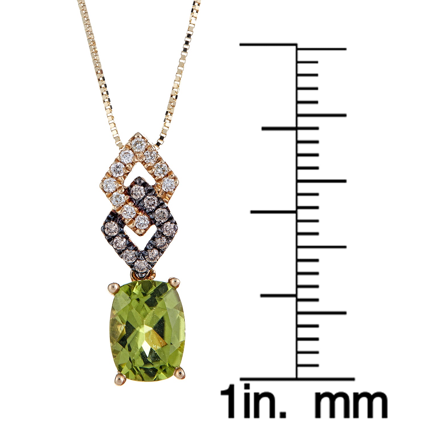 Decorate yourself in elegance with this Pendant is crafted from 10-karat Yellow Gold by Gin & Grace Genuine Peridot Pendant. This Pendant is made up of 6X8 mm Cushion-cut Prong setting Genuine Manchurian Peridot (1 Pcs) 1.40 Carat and Round-Cut Prong setting Natural Brown Diamond (10 Pcs) 0.07 Carat and Round-Cut Prong setting Natural White Diamond (10 Pcs) 0.07 Carat. This Pendant is weight 1.07 grams. The gorgeous Pendant hangs from a 18-inch wheat chain. This delicate Pendant is polished to a high finish shine.