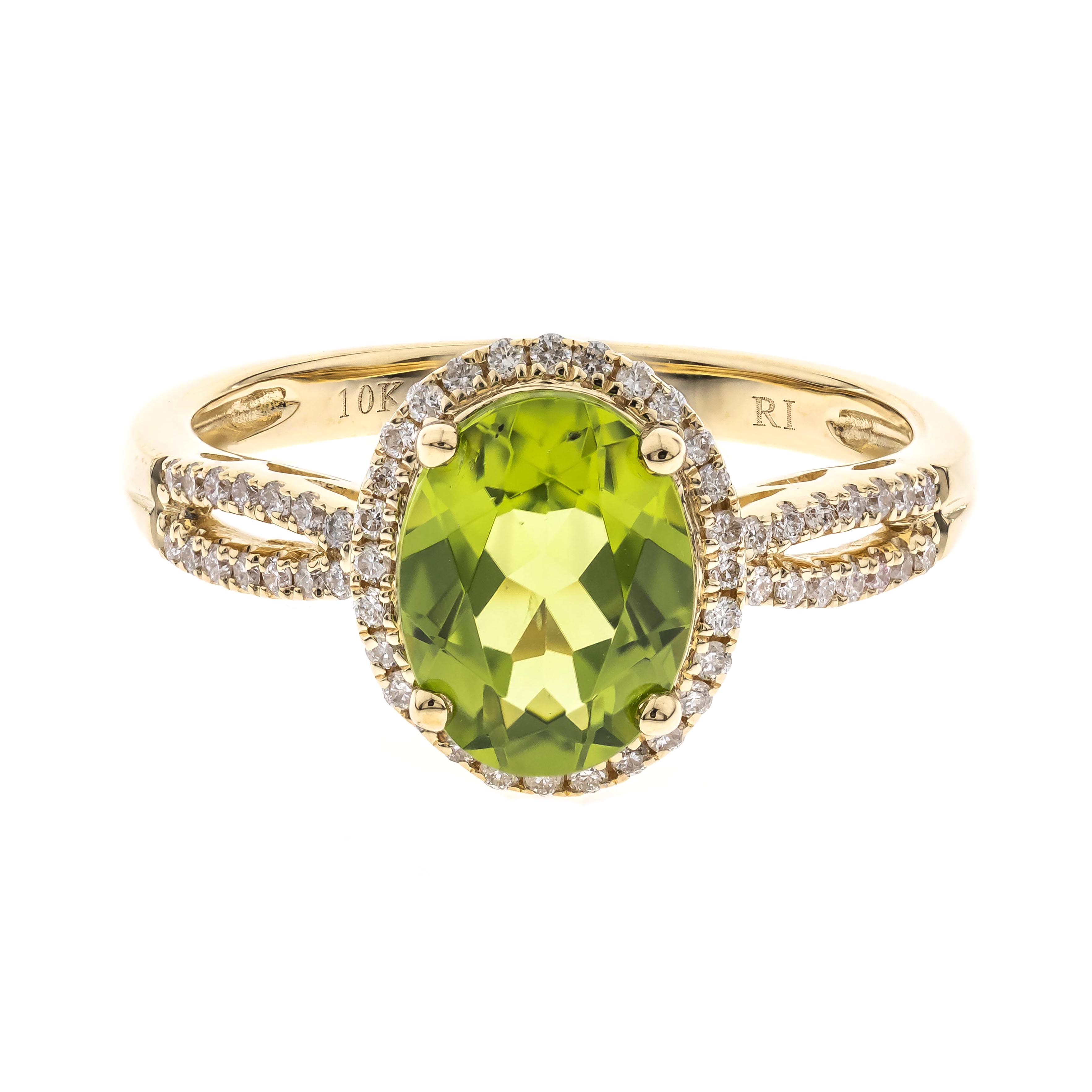 Decorate yourself in elegance with this Ring is crafted from 10-karat Yellow Gold by Gin & Grace. This Ring is made up of Oval-cut (1 pcs) 1.96 carat Manchurian Peridot and Round Cut Diamond (56 Pcs) 0.2 Carat . This Ring is weight 2.52 grams. This delicate Ring is polished to a high finish shine.