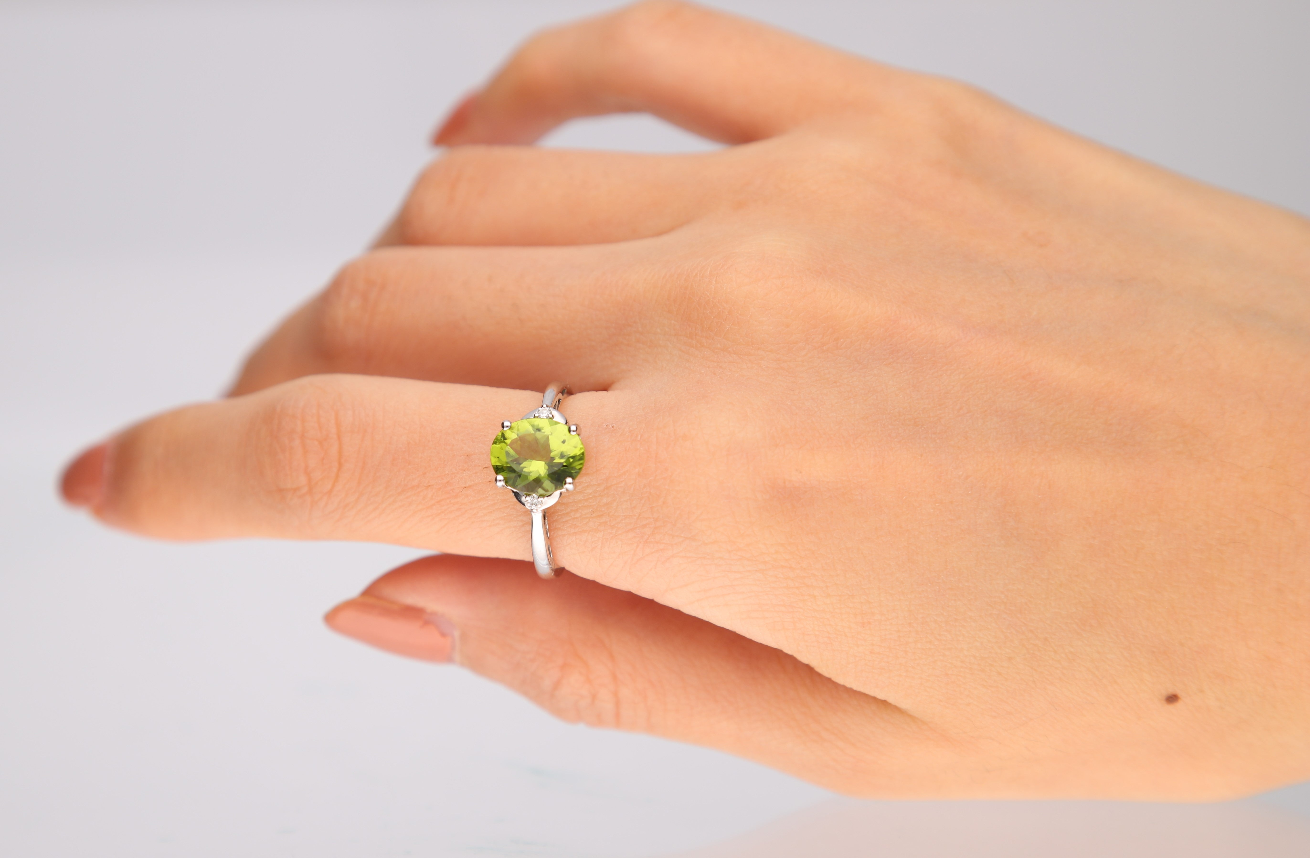 Stunning, timeless and classy eternity Unique Ring. Decorate yourself in luxury with this Gin & Grace Ring. The 10K White Gold jewelry boasts Oval-Cut Prong Setting Genuine Manchurian Peridot (1 pcs) 2.46 Carat, along with Natural Round cut white Diamond (2 Pcs) 0.03 Carat, accent stones for a lovely design. This Ring is weight 2.05 grams. Crafted with 10K White Gold, this delicate Ring is polished to a high finish shine