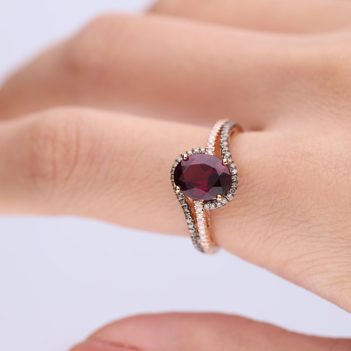 Stunning, timeless and classy eternity Unique Ring. Decorate yourself in luxury with this Gin & Grace Ring. The 10K Rose Gold jewelry boasts Oval-Cut Prong Setting Raspberry color Natural Madagascar Rhodolite Garnet (1 pc) 2.09 Carat, along with Natural Round cut white Diamond (24 Pcs) 0.09 Carat and Natural Round cut Brown Diamond (45 Pcs) 0.20 Carat, accent stones for a lovely design. This Ring is weight 2.39 grams. Crafted with 10K Rose Gold, this delicate Ring is polished to a high finish shine