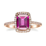 Stunning, timeless and classy eternity Unique Ring. Decorate yourself in luxury with this Gin & Grace Ring. The 10K Rose Gold jewelry boasts Emerald-Cut Prong Setting Raspberry color Natural Madagascar Rhodolite Garnet (1 pc) 1.82 Carat, along with Natural Round cut white Diamond (46 Pcs) 0.20 Carat , accent stones for a lovely design. This Ring is weight 1.85 grams. Crafted with 10K Rose Gold, this delicate Ring is polished to a high finish shine