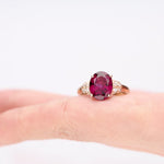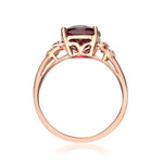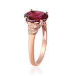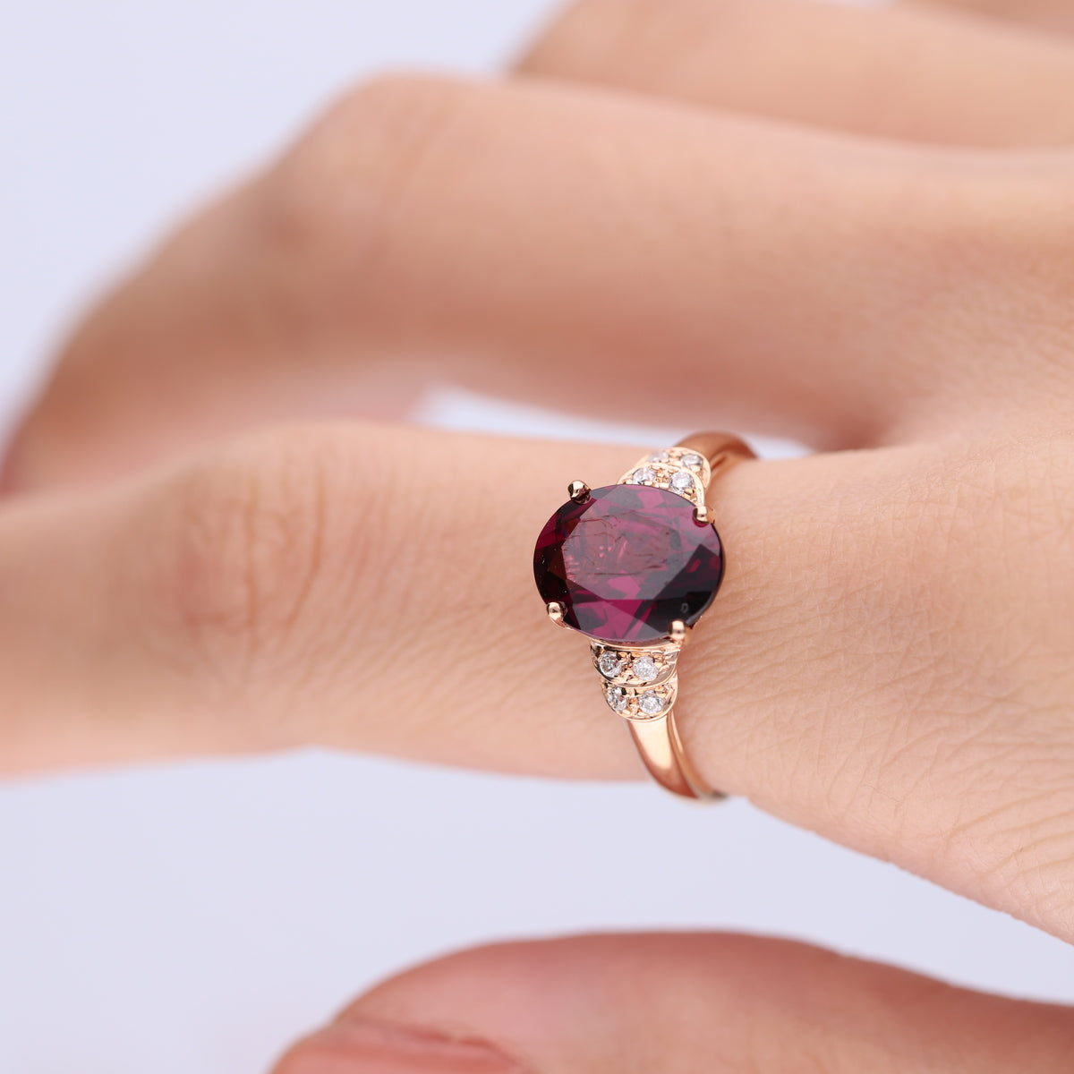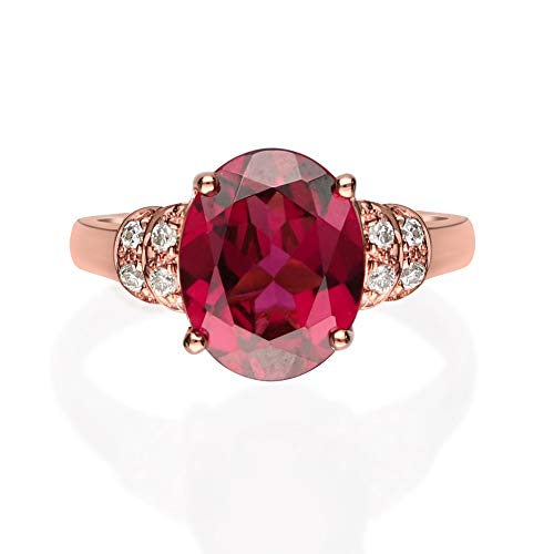 A gorgeous oval-cut Raspberry color Natural Madagascar Rhodolite Garnet gemstone centers this remarkable Gin & Grace ring and accented with round-cut diamonds on its sides. Crafted of beautiful 14 karat Rose gold, this ring shines with a highly polished finish. Gemstone colors: Red Gemstone shapes: Oval One prong-set oval-cut Raspberry color Natural Madagascar Rhodolite Garnet measures 8 mm wide x 10 mm long Gemstone weight: 3.15 carat Total gemstone weight: 3.15 carat Diamonds: Eight Diamond cut: Round-Cut Diamond measurements: Each measures 1 mm Diamond weight: 0.08 carat Color: G-H Clarity: I1-I2 Setting: Pave-set Metal: 14k rose gold Finish: High polish Metal weight: 2.23 grams Ring setting dimensions: 19 mm wide x 24 mm long x 6 mm deep Band dimensions: 2 mm wide