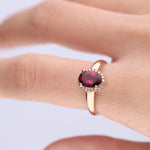 Stunning, timeless and classy eternity Unique Ring. Decorate yourself in luxury with this Gin & Grace Ring. The 10K Rose Gold jewelry boasts Oval-Cut Prong Setting Raspberry color Natural Madagascar Rhodolite Garnet (1 pcs) 1.47 Carat, along with Natural Round cut white Diamond (22 Pcs) 0.12 Carat, accent stones for a lovely design. This Ring is weight 2.28 grams. Crafted with 10K Rose Gold, this delicate Ring is polished to a high finish shine.