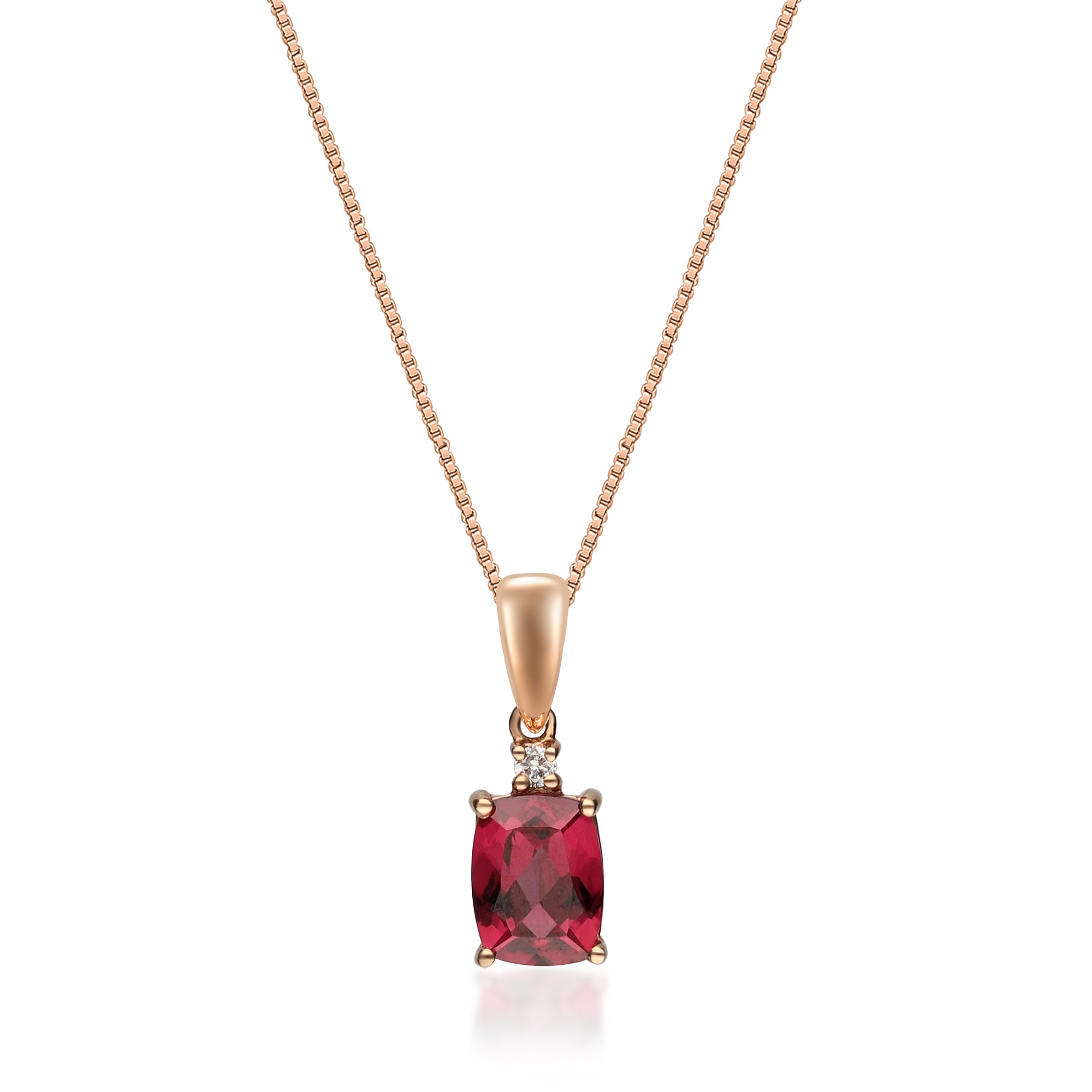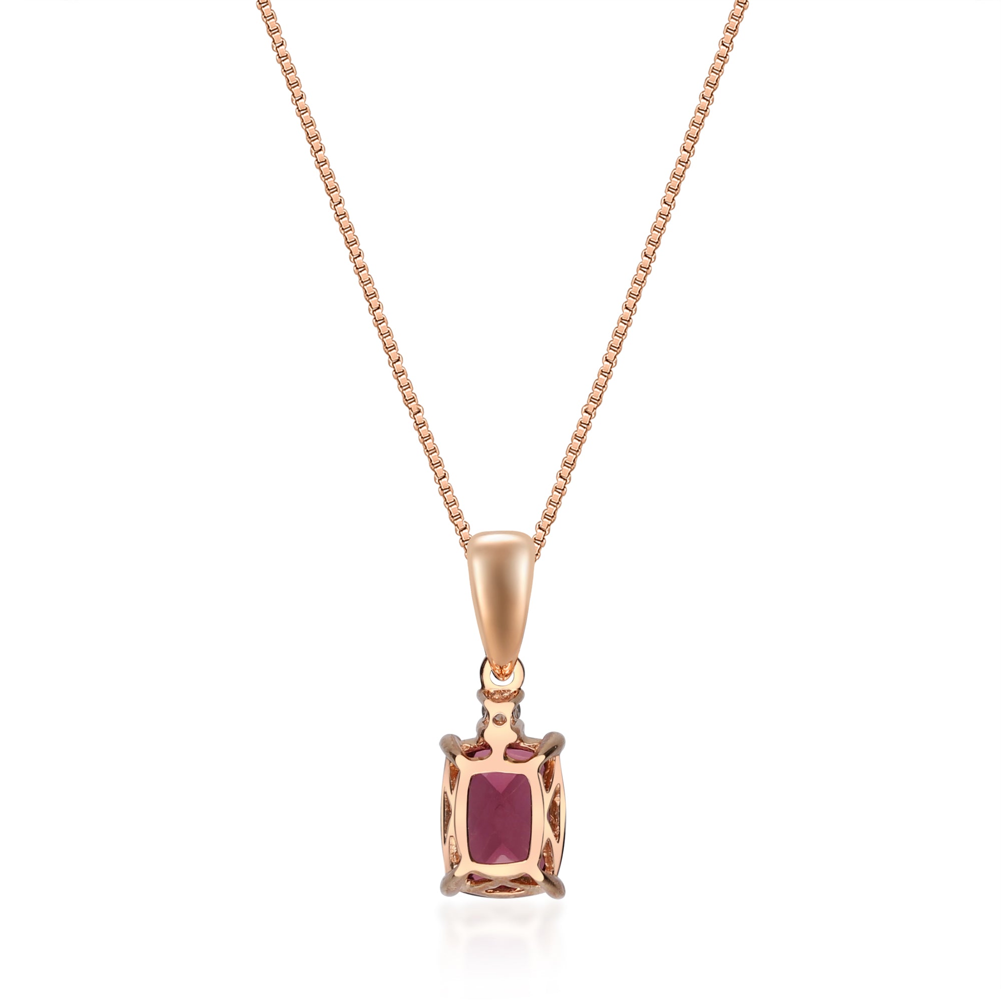 Stunning, timeless and classy eternity Unique Pendant. Decorate yourself in luxury with this Gin & Grace Pendant. The 10K Rose Gold jewelry boasts Cushion-Cut Prong Setting Raspberry color Natural Madagascar Rhodolite Garnet (1 pc) 1.79 Carat, along with Natural Round cut white Diamond (1 Pcs) 0.03 Carat, accent stones for a lovely design. This Pendant is weight 0.66 grams. Crafted with 10K Rose Gold, this delicate Pendant is polished to a high finish shine.