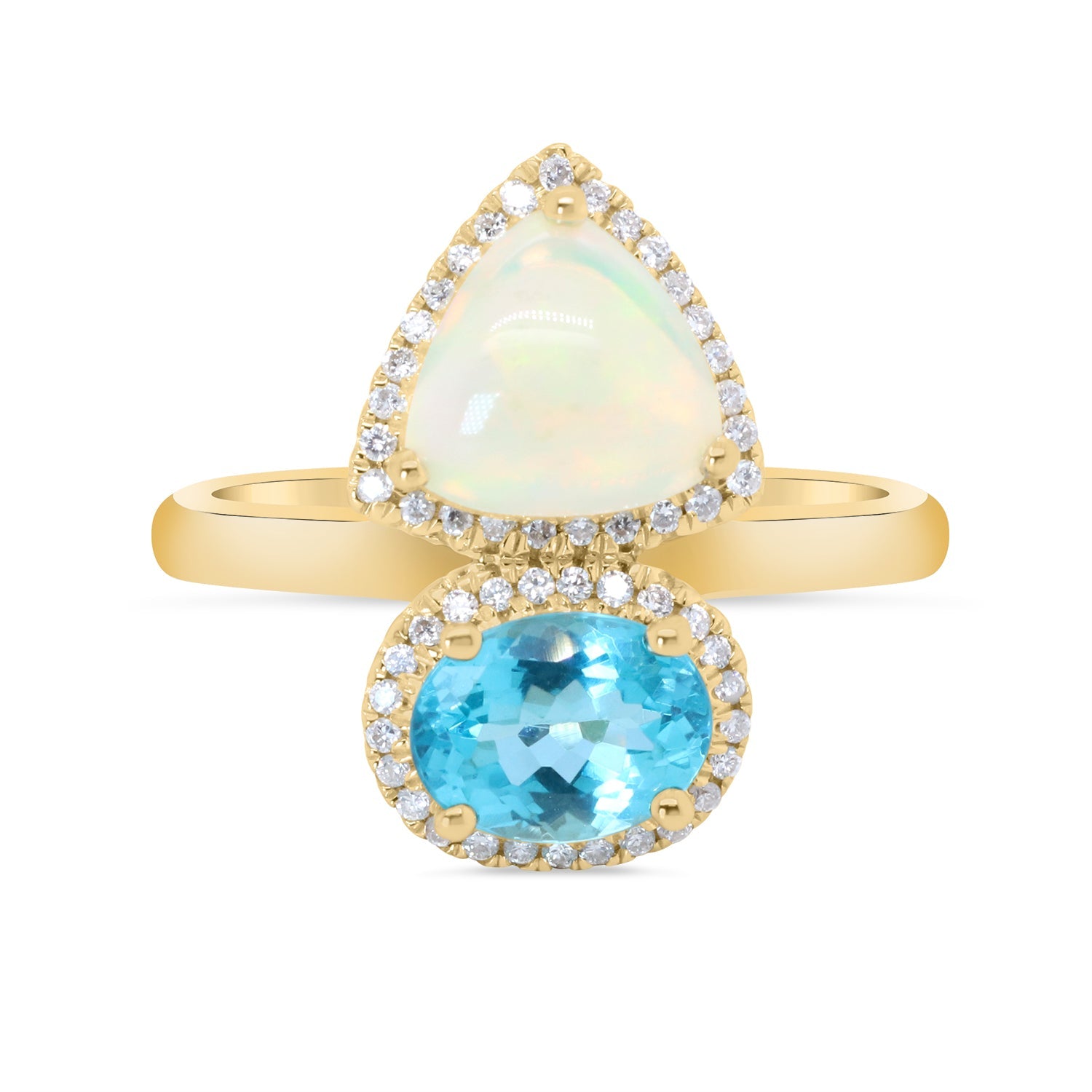 Decorate yourself in elegance with this Ring crafted from 10-karat Yellow Gold by Gin & Grace. This Ring is made up of appetite Oval-cut (1 pcs) 1.38, African Opal trillion-cut (1 pcs) 1.38, and Round-cut Diamond (52 pcs) 0.19 Carat. This Ring weighs 3.18 grams. This delicate Ring is polished to a high finish shine.