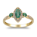 Decorate yourself in elegance with this Ring is crafted from 10-karat yellow Gold by Gin & Grace. This Ring is made up of Marquise-Cut Emerald (1 Pcs) 0.34 carat, round-cut emerald (2 pcs) 0.15 carat and round-cut white diamond (26 pcs) 0.17 carat. This Ring is weight 1.50 grams. This delicate Ring is polished to a high finish shine.