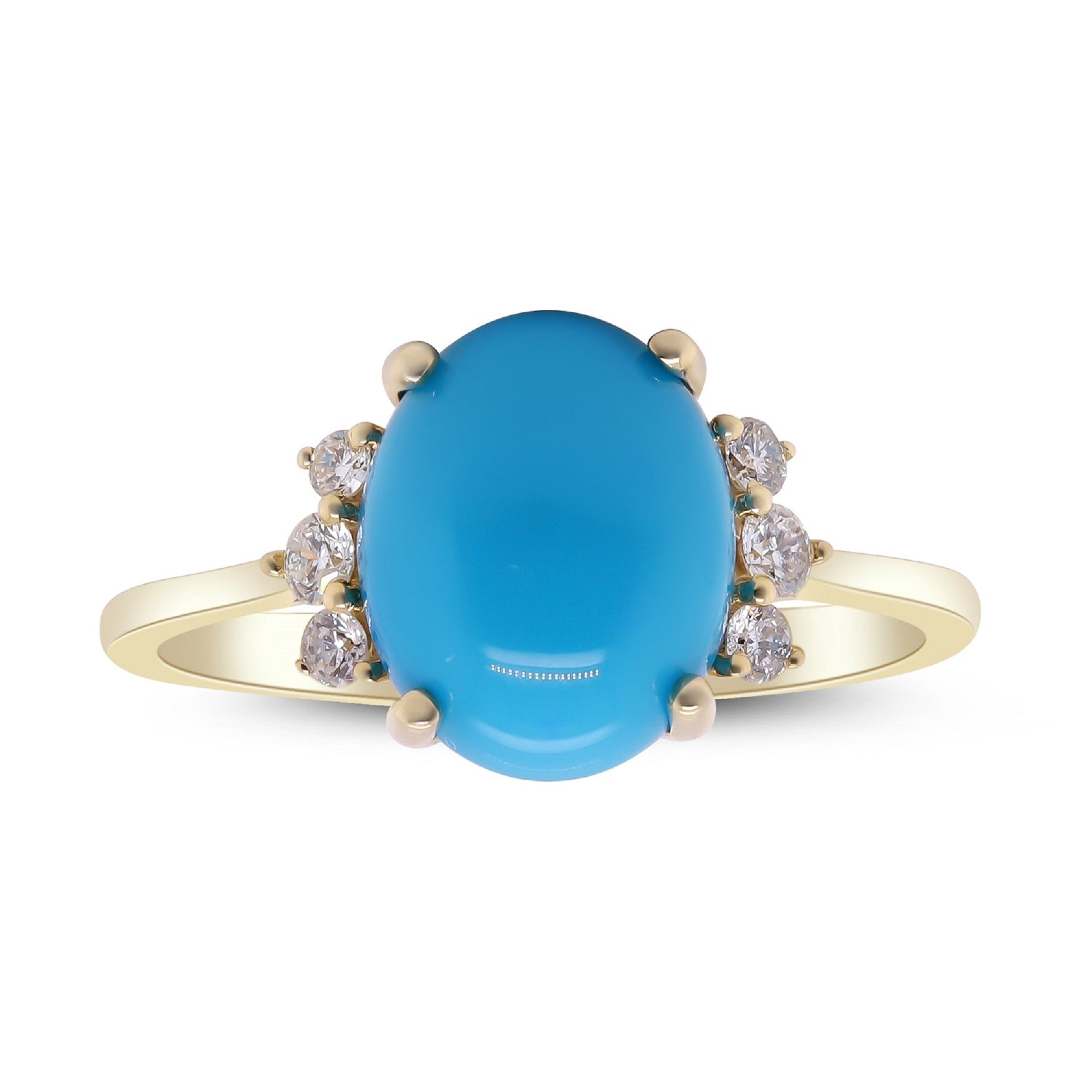 Decorate yourself in elegance with this Ring crafted from 14-karat yellow Gold by Gin & Grace. This Ring is made up of 8*10MM Arizona Turquoise Oval-Cut (1 pcs) 2.97 and Round-cut diamonds (6 pcs) 0.15 Carat. This Ring weighs 1.98 grams. This delicate Ring is polished to a high finish shine.