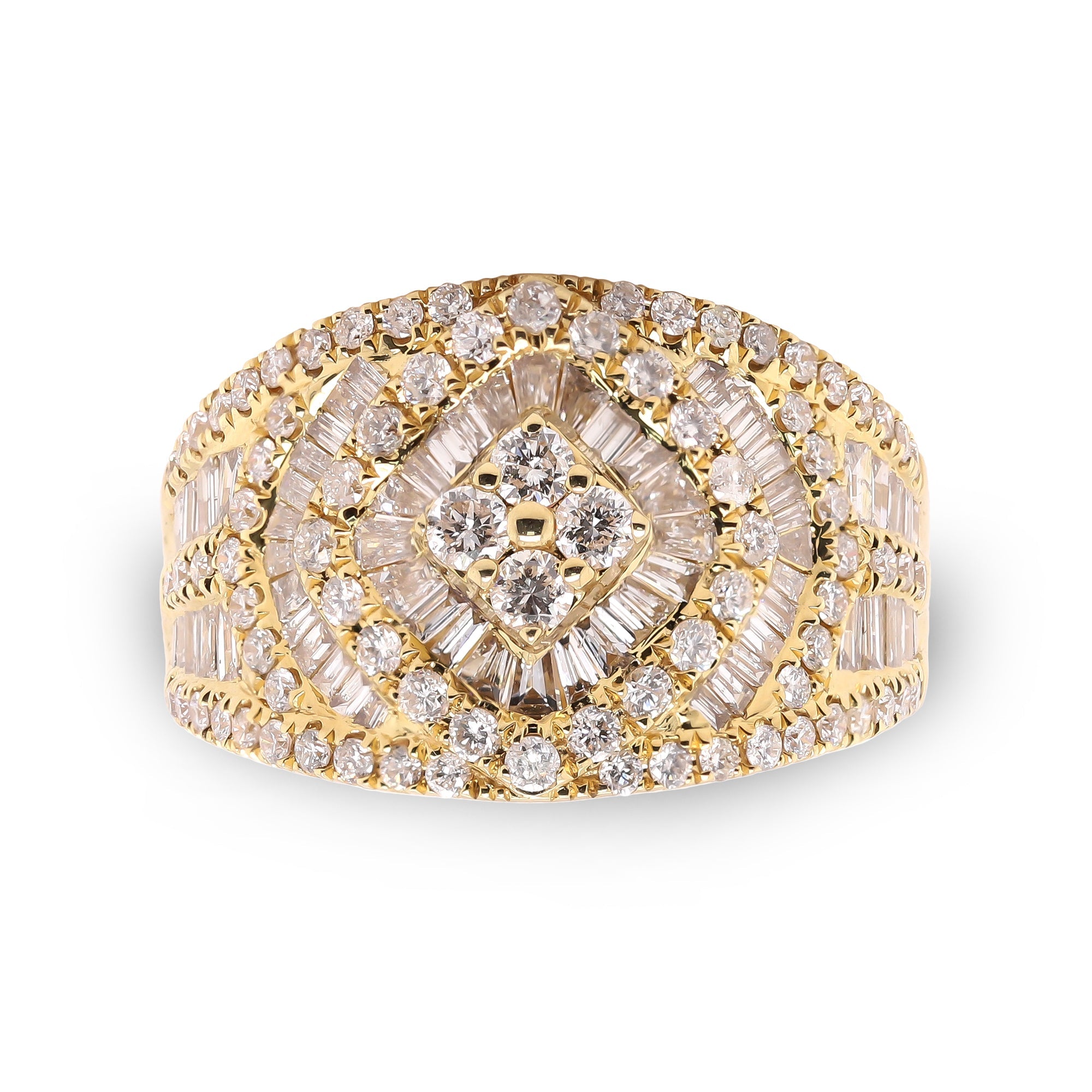 Decorate yourself in elegance with this Ring is crafted from 14-karat Yellow Gold by Gin & Grace Ring. This Ring is made up of Round-Cut White Diamond (84 Pcs) 0.81 Carat and Baguette-cut white Diamond (69pcs) 0.80 carat. This Ring is weight 5.33 grams. This delicate Ring is polished to a high finish shine.