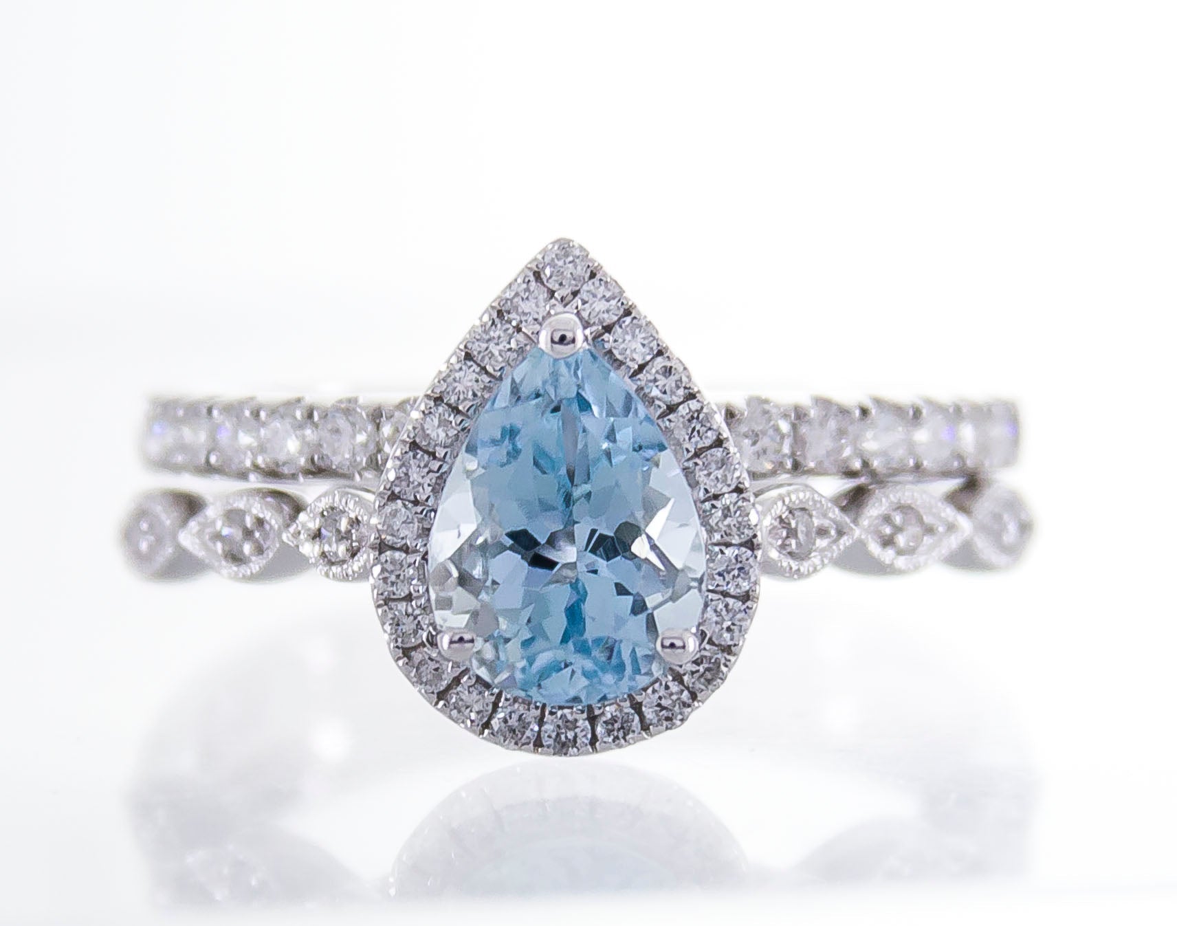 Stunning, timeless and classy eternity Engagement ring. Decorate yourself in luxury with this Gin & Grace ring. This ring is made up of Pear-Cut Prong Setting Genuine Brazilian Aquamarine (1 pcs) 0.90 Carat and Round-Cut Prong Setting Diamond (49 pcs) 0.40 Carat accent stones for a lovely design. This ring is weight 3.90 grams. The ring is crafted of shining 14-karat White Gold and is completed by a highly polished finish.