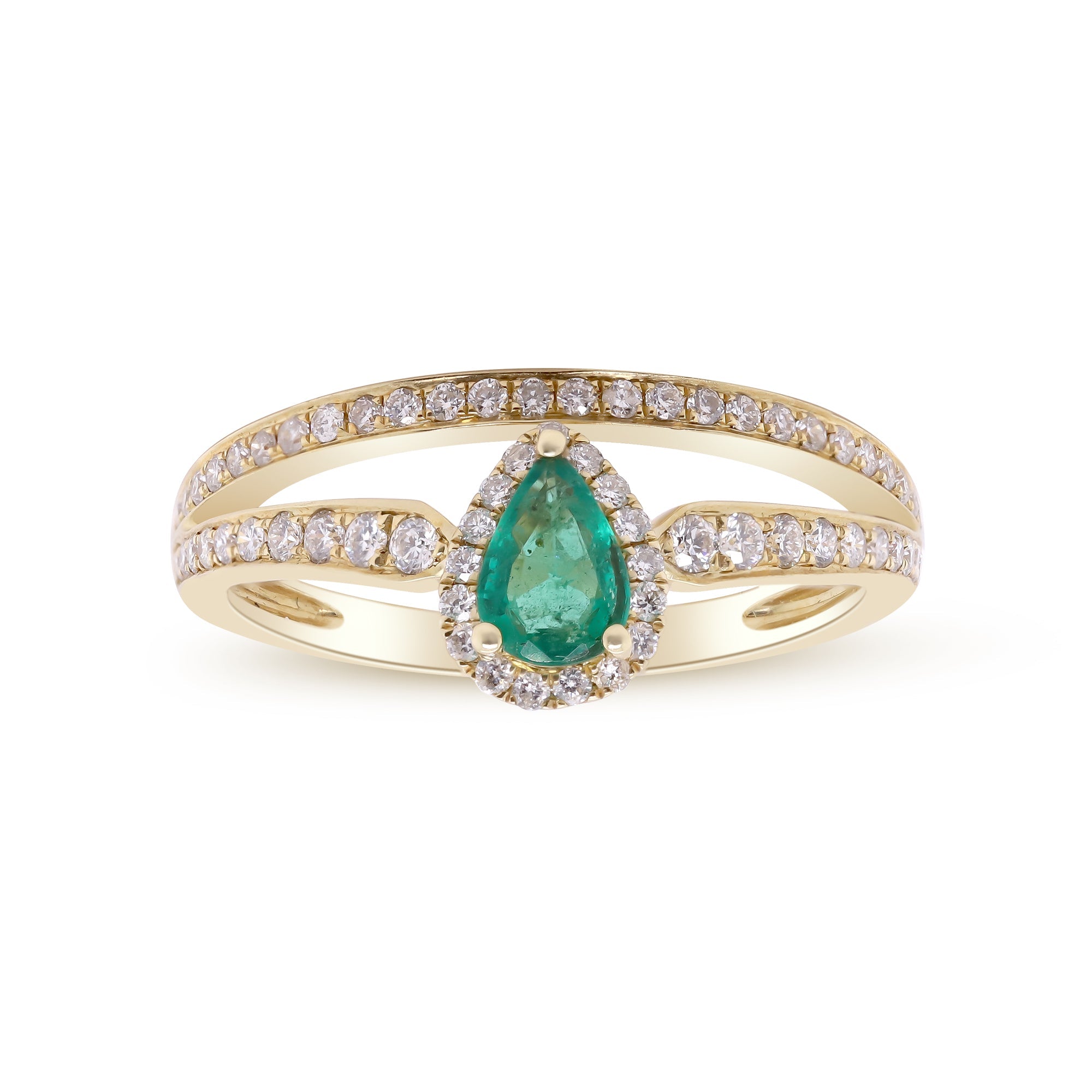 The centerpiece of this ring is a prong-set oval-cut emerald, measuring 0.32 carat. The emerald exhibits a captivating green hue and is cut to maximize its brilliance and beauty. Surrounding the emerald are 63 prong-set pear-cut white diamonds, totaling 0.40 carats. These dazzling diamonds enhance the overall design of the ring, adding a brilliant and glamorous touch.