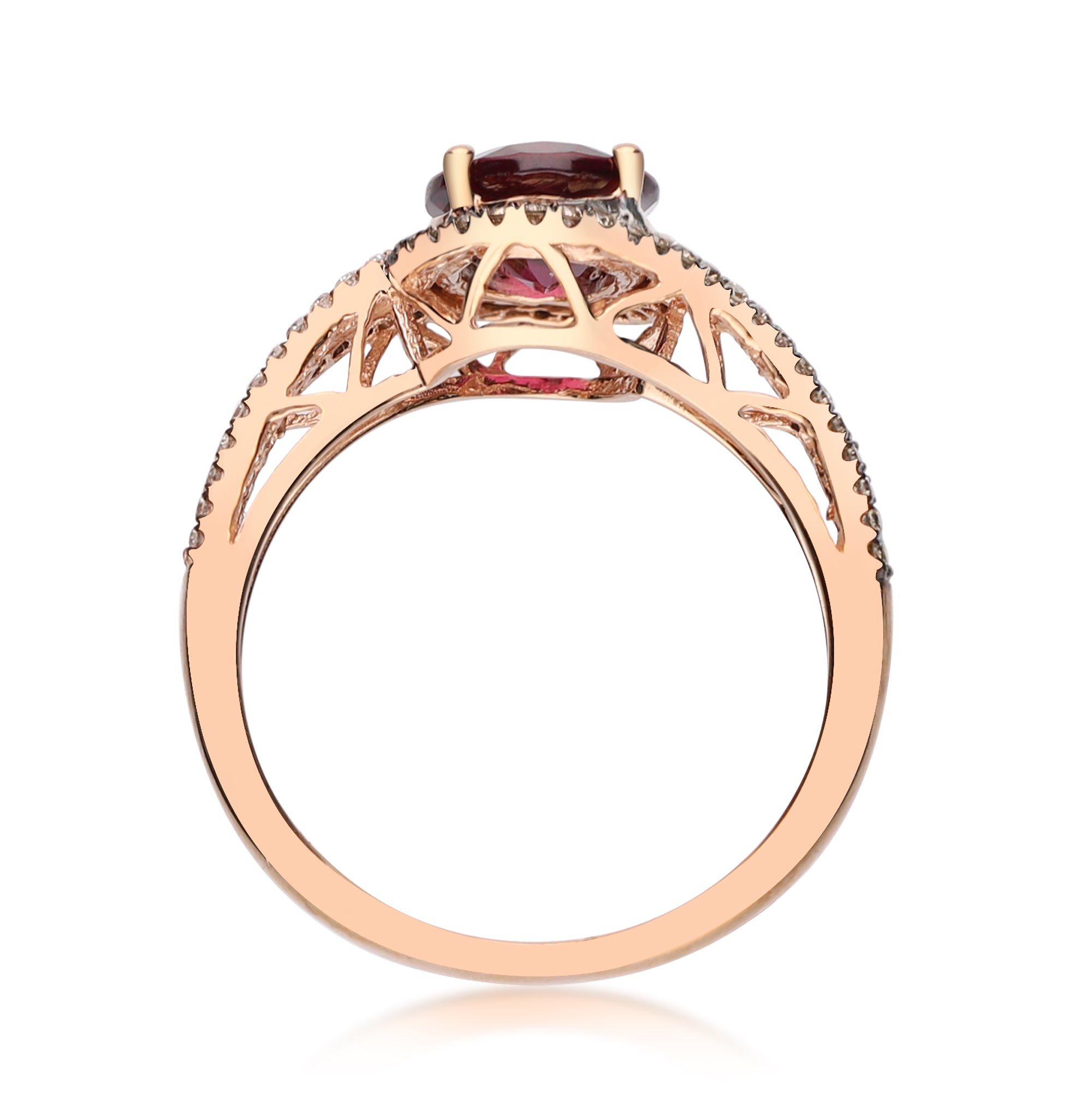 Stunning, timeless and classy eternity Unique Ring. Decorate yourself in luxury with this Gin & Grace Ring. The 10K Rose Gold jewelry boasts Oval-Cut Prong Setting Raspberry color Natural Madagascar Rhodolite Garnet (1 pc) 2.09 Carat, along with Natural Round cut white Diamond (24 Pcs) 0.09 Carat and Natural Round cut Brown Diamond (45 Pcs) 0.20 Carat, accent stones for a lovely design. This Ring is weight 2.39 grams. Crafted with 10K Rose Gold, this delicate Ring is polished to a high finish shine