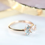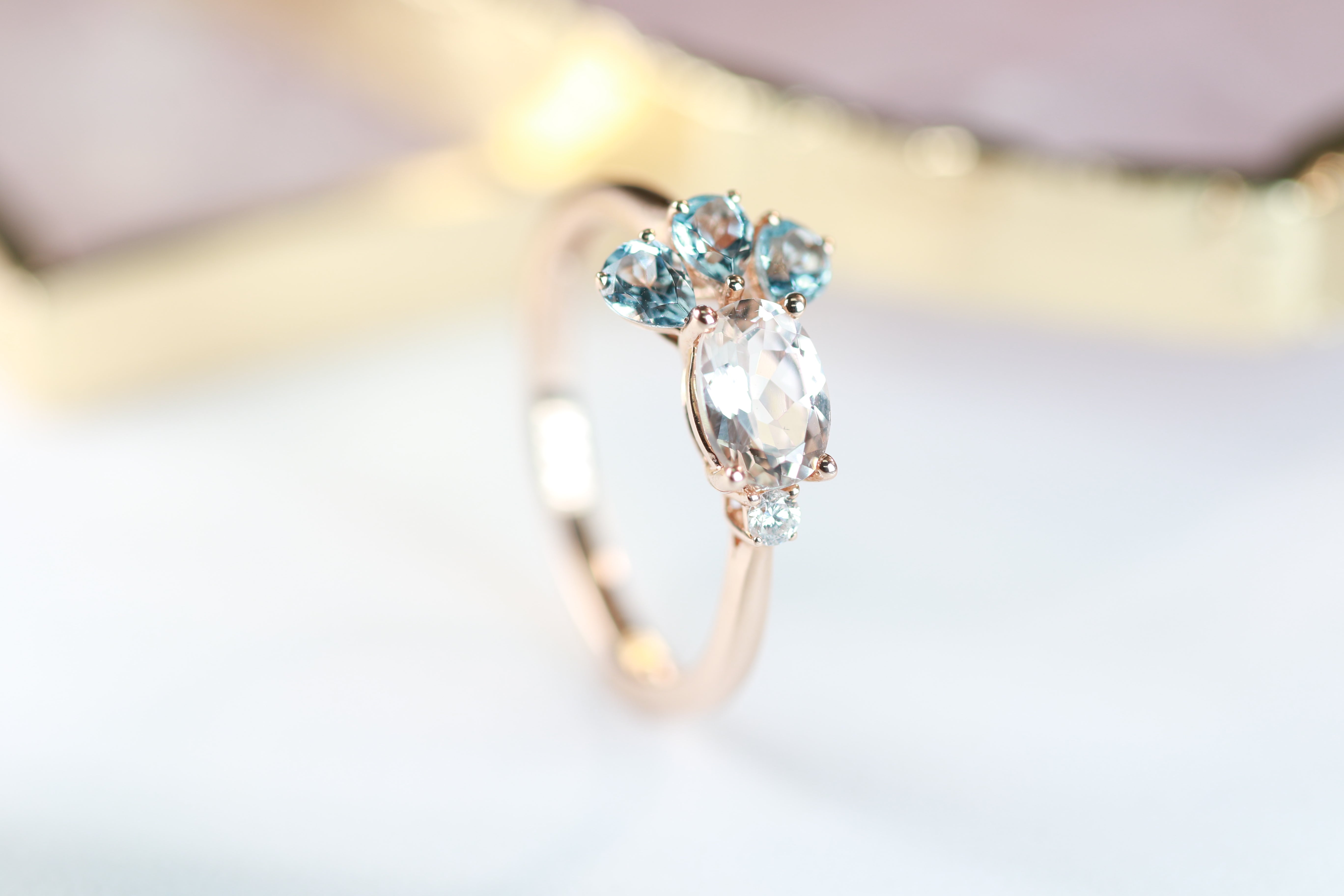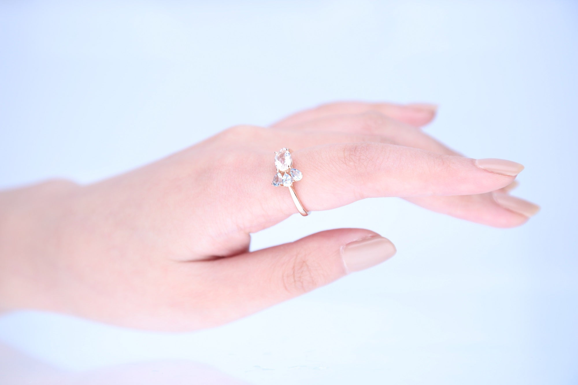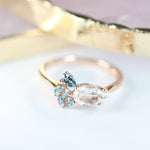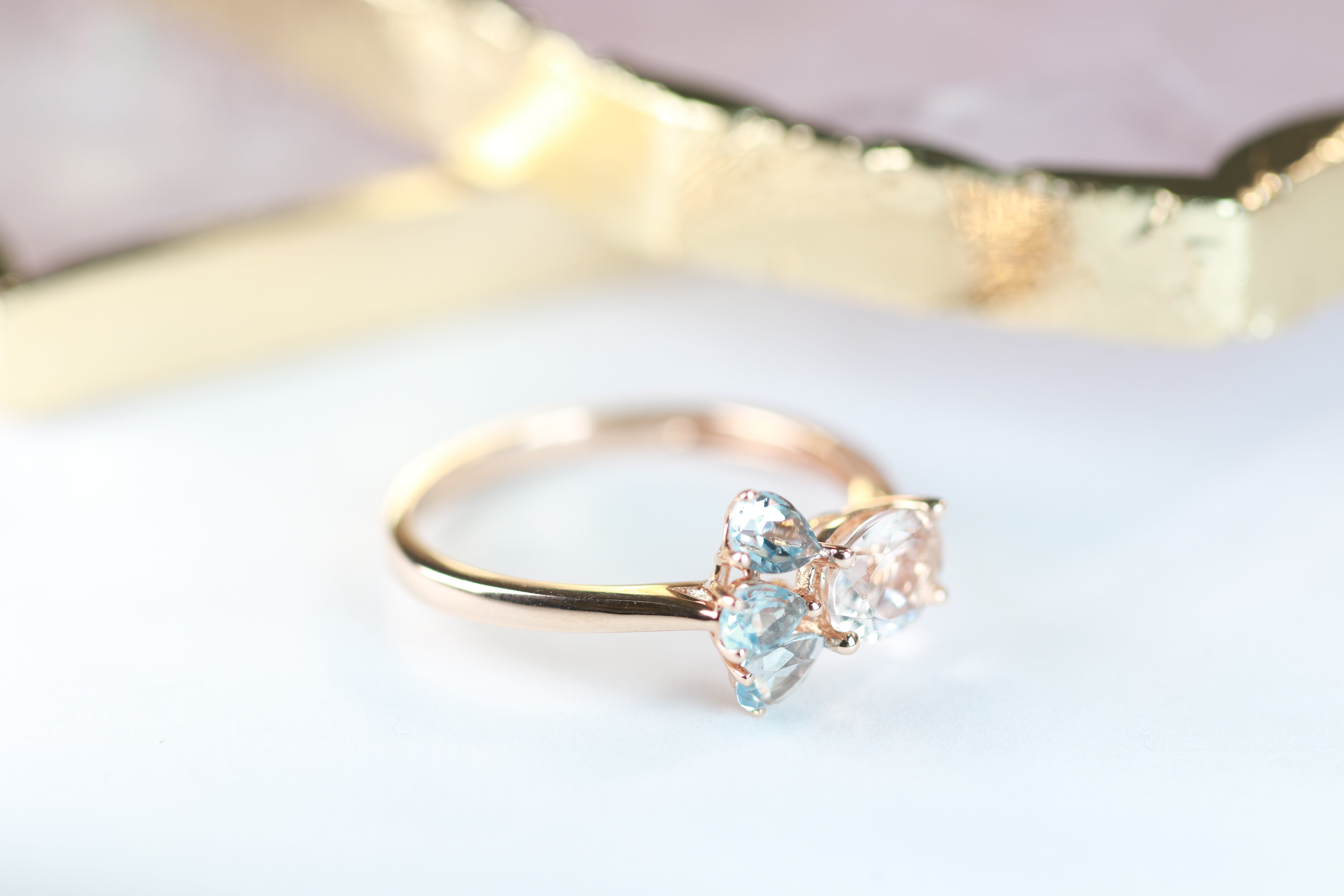 A large oval-cut Genuine Madagascar Morganite gemstone is set at the center and 3 Genuine Brazilian Aquamarine Gemstone of this lovely Gin & Grace ring, accentuated by one glittering diamond accents. This jewelry is crafted of 10-karat Rose gold with a sleek polish. Gemstone colors: Pink & Blue Gemstone shapes: Oval & Pear One prong-set oval-cut Madagascar Morganite measure 5 mm wide x 7 mm long and Three Prong-set Pear-cut Brazilian Aquamarine measure 3 mm wide x 4 mm long Total gemstone weight: 1.02 carats Diamonds: One Diamond cut: Round Diamond measurements: 1 mm Diamond weight: 0.04 carat Color: G-H Clarity: I1-I2 Setting: Prong Metal: 10k Rose gold Finish: High polish Metal weight: 1.80 grams Ring setting dimensions: 11 mm wide x 10 mm long Band dimensions: 2 mm wide