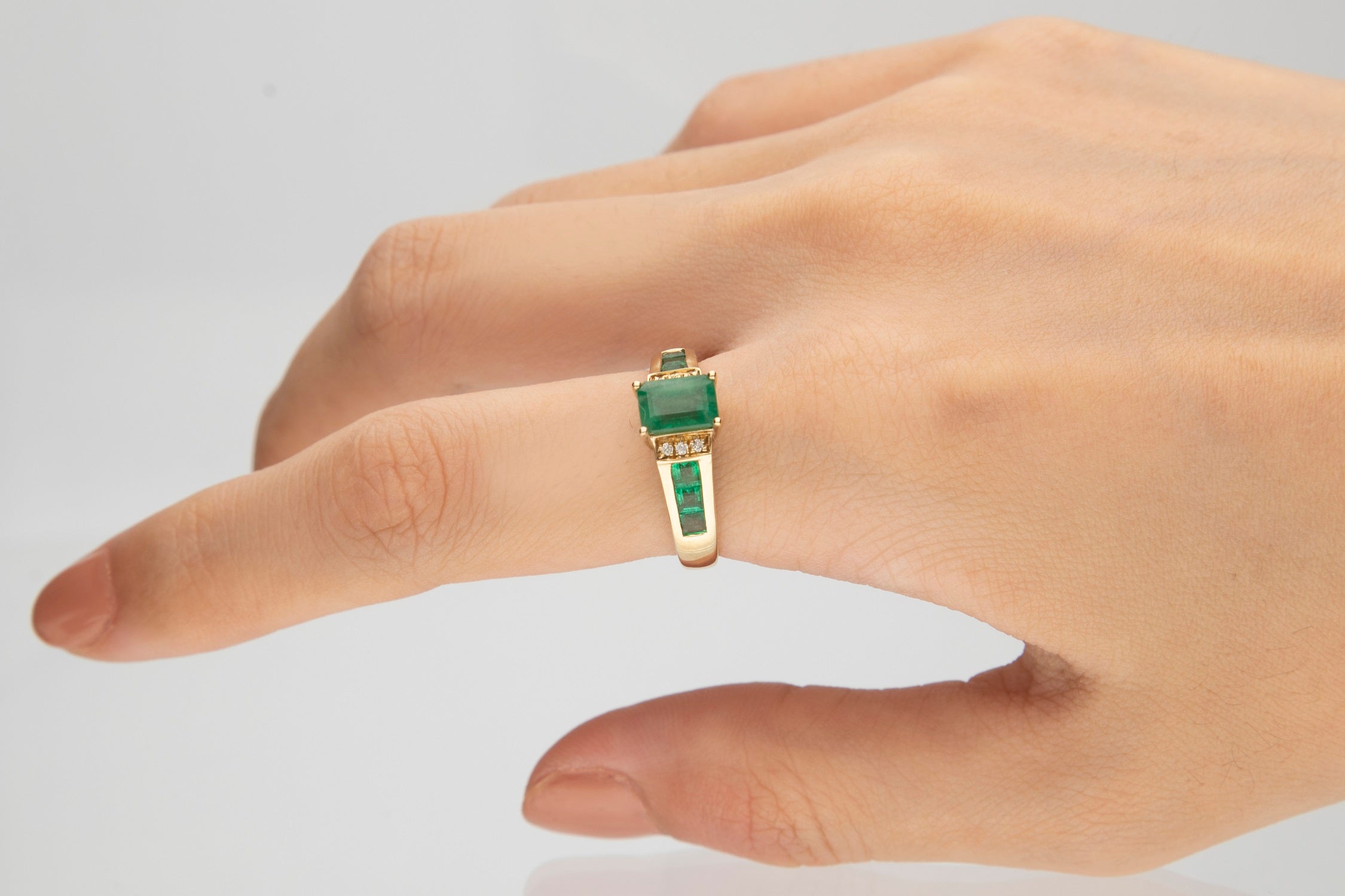 At the center of the ring is a prong-set Zambian emerald, cut in a classic square shape, measuring 5mm wide by 7mm long. With a weight of 7/8 carat, this Zambian Emerald radiates a deep, rich green color, symbolizing beauty and abundance. Surrounding the center emerald are six channel-set princess-cut natural emeralds, each measuring 2.5mm wide by 2.5mm long, adding a touch of elegance and complementing the center stone. These emeralds have a combined weight of 1/2 carat, enhancing the overall allure of the ring.