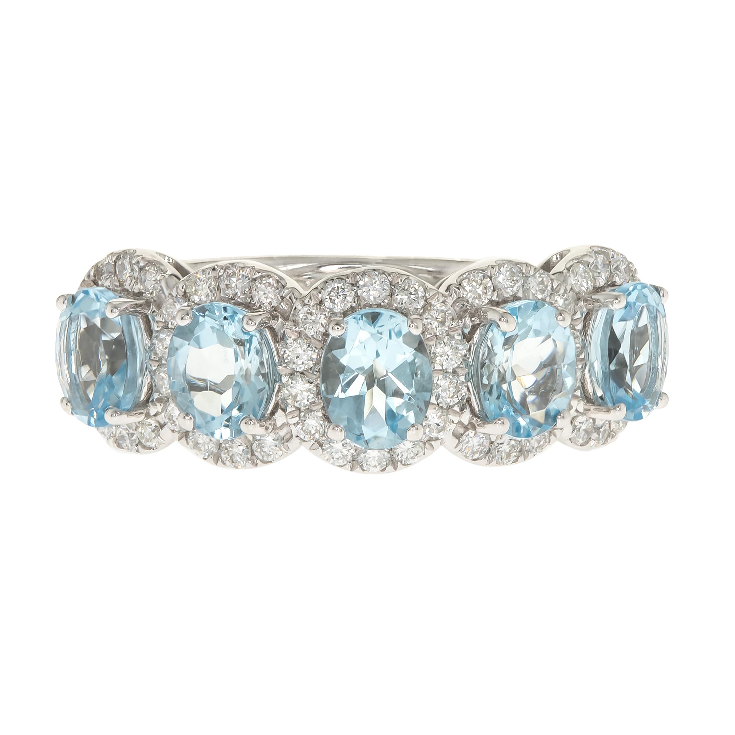 Decorate yourself in elegance with this Ring is crafted from 14K White Gold by Gin & Grace. This Ring is made up of Oval-Cut Aquamarine (5 Pcs) 1.63 carat and round-cut white diamond (54 pcs) 0.41 carat. This Ring is weight 4.33 grams. This delicate Ring is polished to a high finish shine.