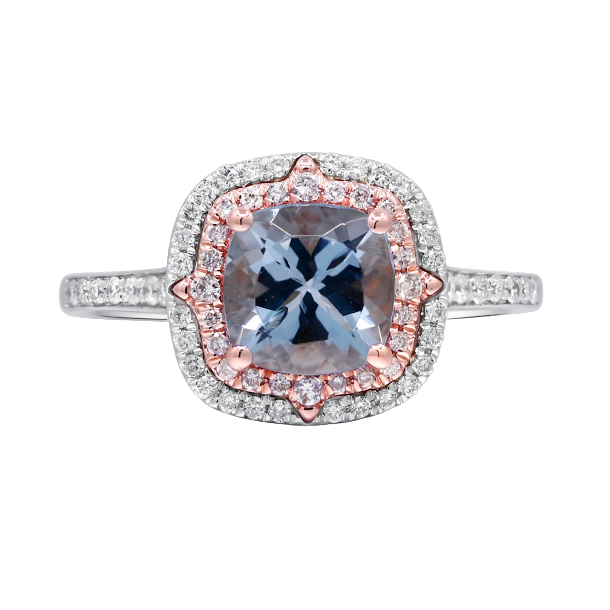 Decorate yourself in elegance with this Ring is crafted from 14KÂ Two Tone Gold by Gin & Grace. This Ring is made up of 7.0 mm Cushion-Cut Brazilian Aquamarine (1 Pcs) 1.41 carat and Round-cut White Diamond (66 Pcs) 0.30 carat. This Ring is weight 2.78 grams. This delicate Ring is polished to a high finish shine.