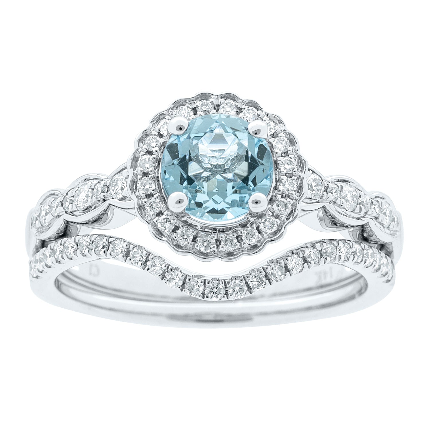 Decorate yourself in elegance with this Ring is crafted from 14K White Gold by Gin & Grace. This Ring is made up of Round-Cut Aquamarine (1 Pcs) 0.73 carat and round-cut white diamond (54 pcs) 0.34 carat. This Ring is weight 5.47 grams. This delicate Ring is polished to a high finish shine.