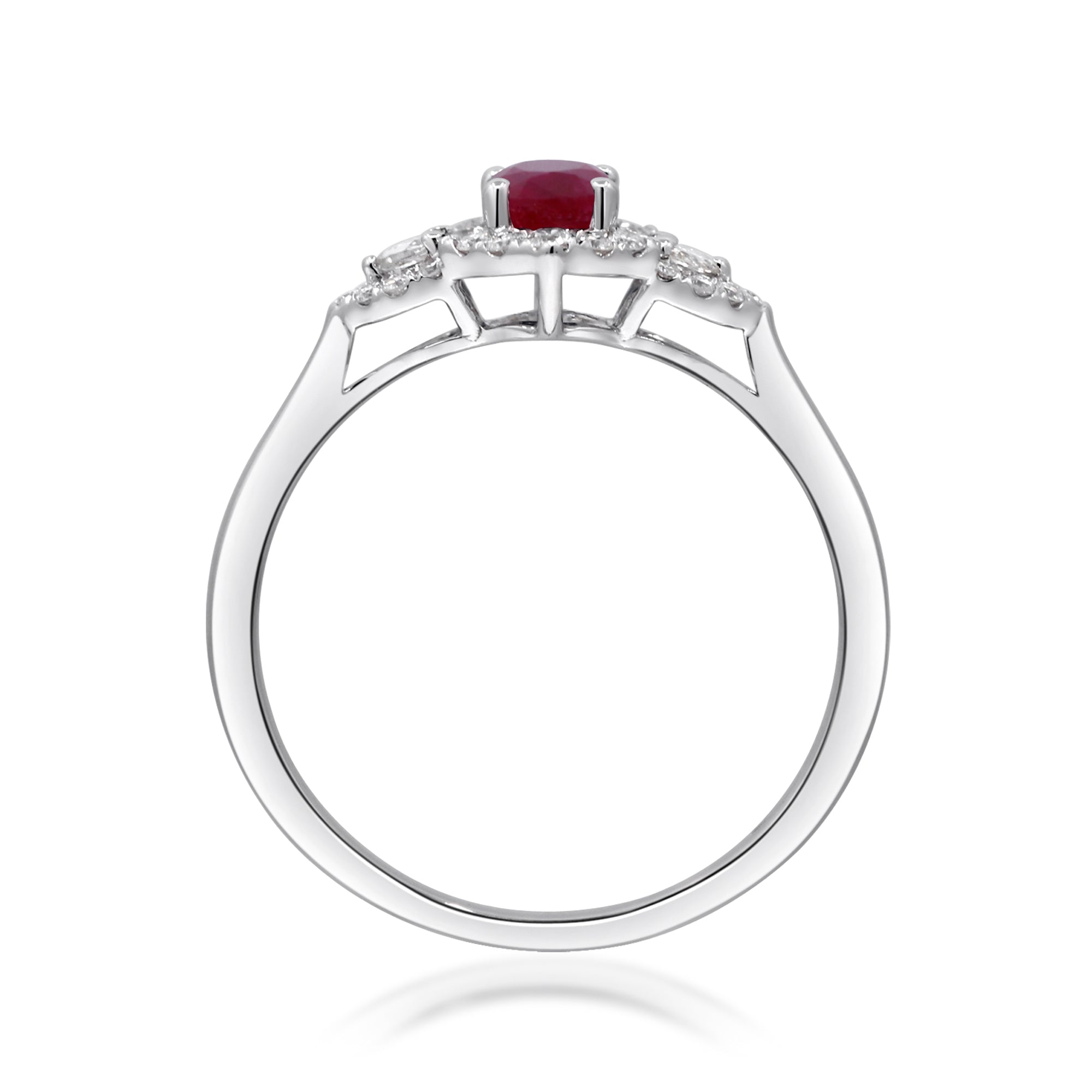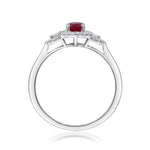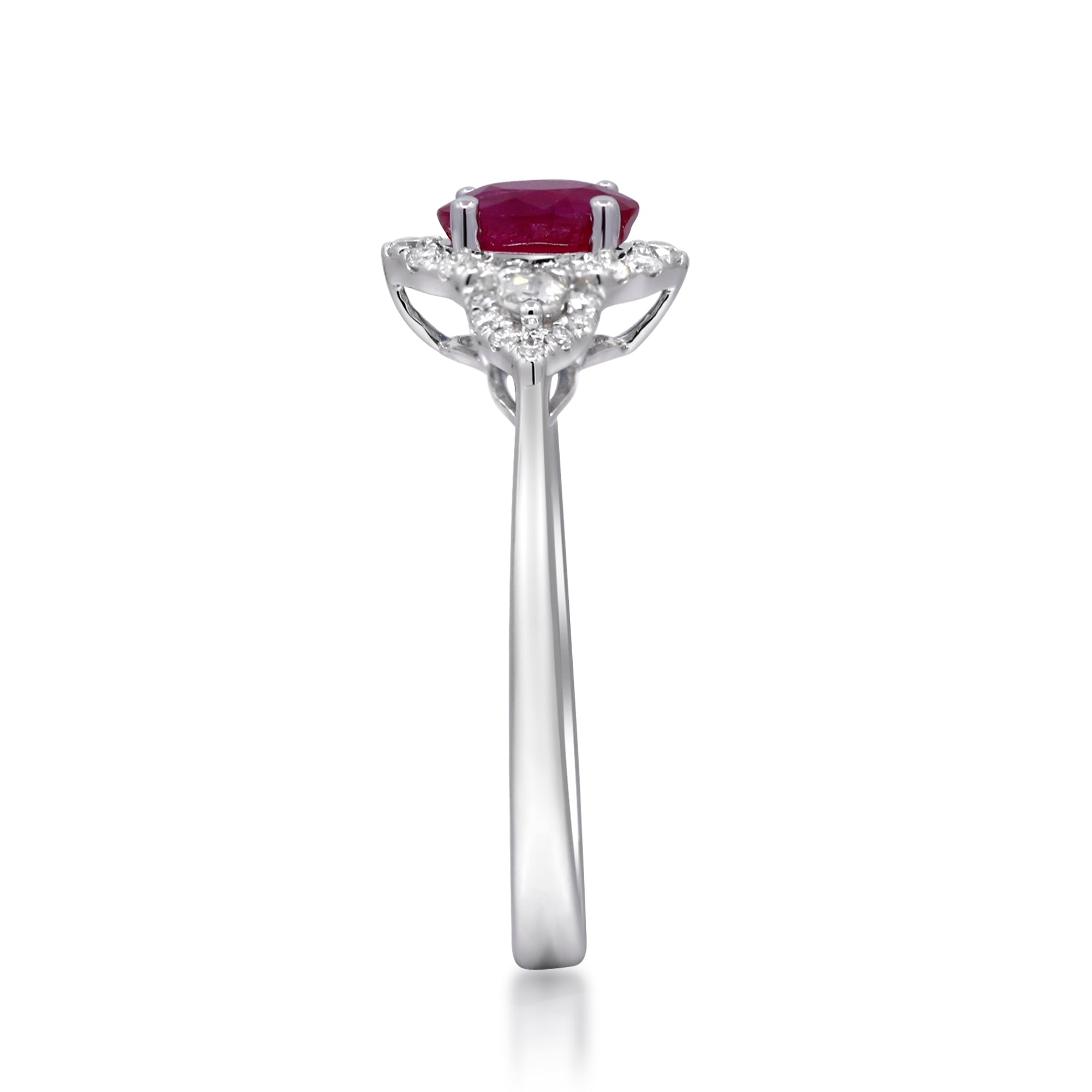 Decorate yourself in elegance with this Ring crafted from 14-karat White Gold by Gin & Grace. This Ring is made up of 6x4 mm Oval-Cut Mozambique Ruby (1 pcs) 0.55 carat and Round-cut White Diamond (32 Pcs) 0.20 Carat. This Ring weighs 1.88 grams. This delicate Ring is polished to a high finish shine.