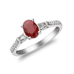 Decorate yourself in elegance with this Ring crafted from 14-karat White Gold by Gin & Grace. This Ring is made up of 7x5 mm Oval-Cut Mozambique Ruby (1 pcs) 0.97 carat and Round-cut White Diamond (14 Pcs) 0.10 Carat, Baguette-cut White Diamond (2 pcs) 0.08 carat. This Ring weighs 2.12 grams. This delicate Ring is polished to a high finish shine.