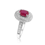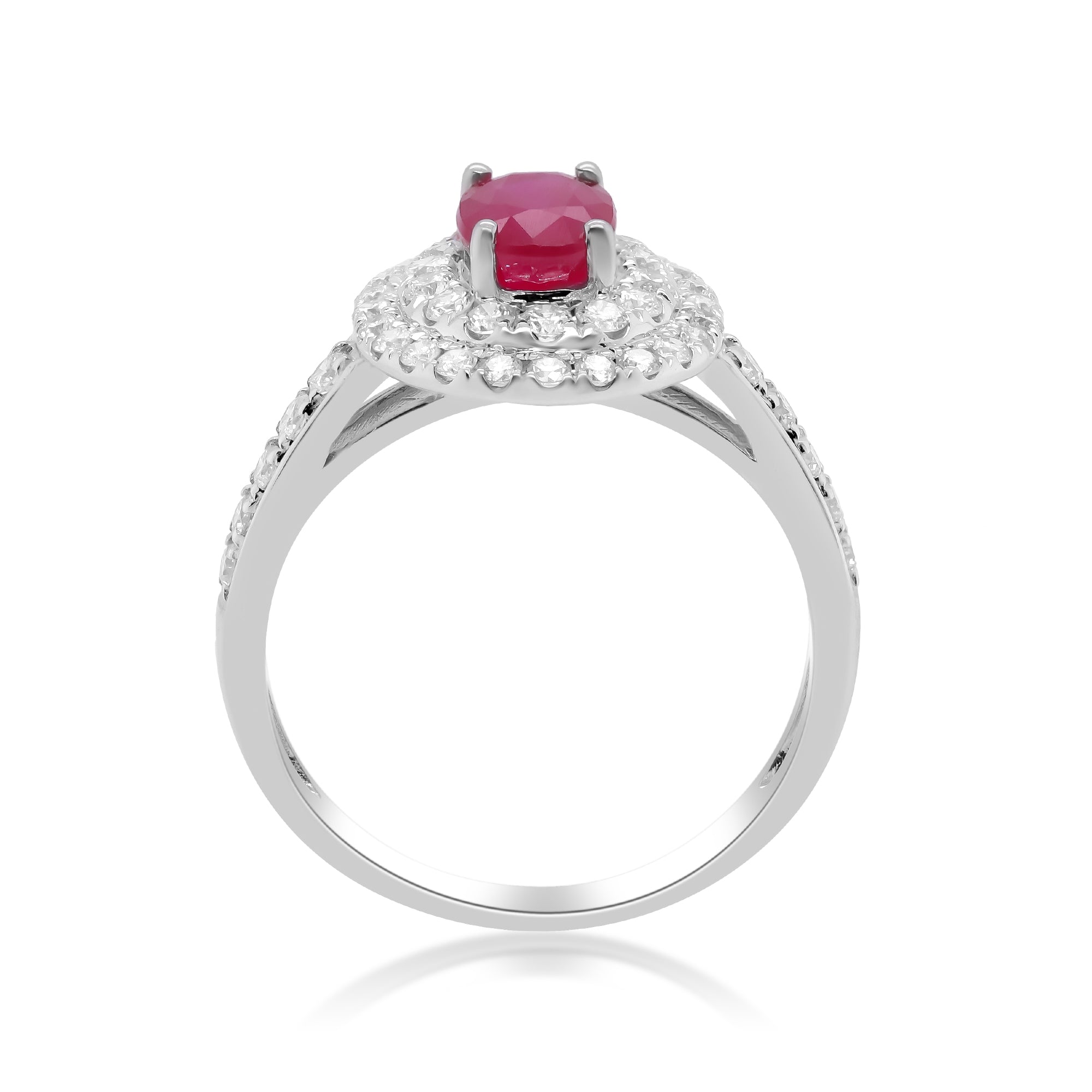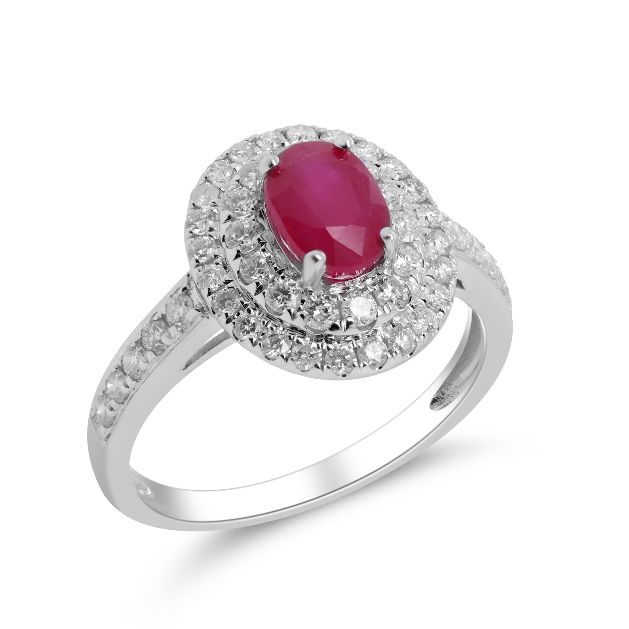 Decorate yourself in elegance with this Ring crafted from 14-karat white Gold by Gin & Grace. This Ring is made up of 5*7 mm Oval-Cut Mozambique Ruby (1 pcs) 1.23 carat and Round-cut Diamond (48 pcs) 0.65 Carat. This Ring weighs 2.88 grams. This delicate Ring is polished to a high finish shine.