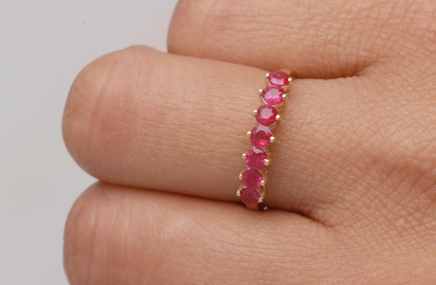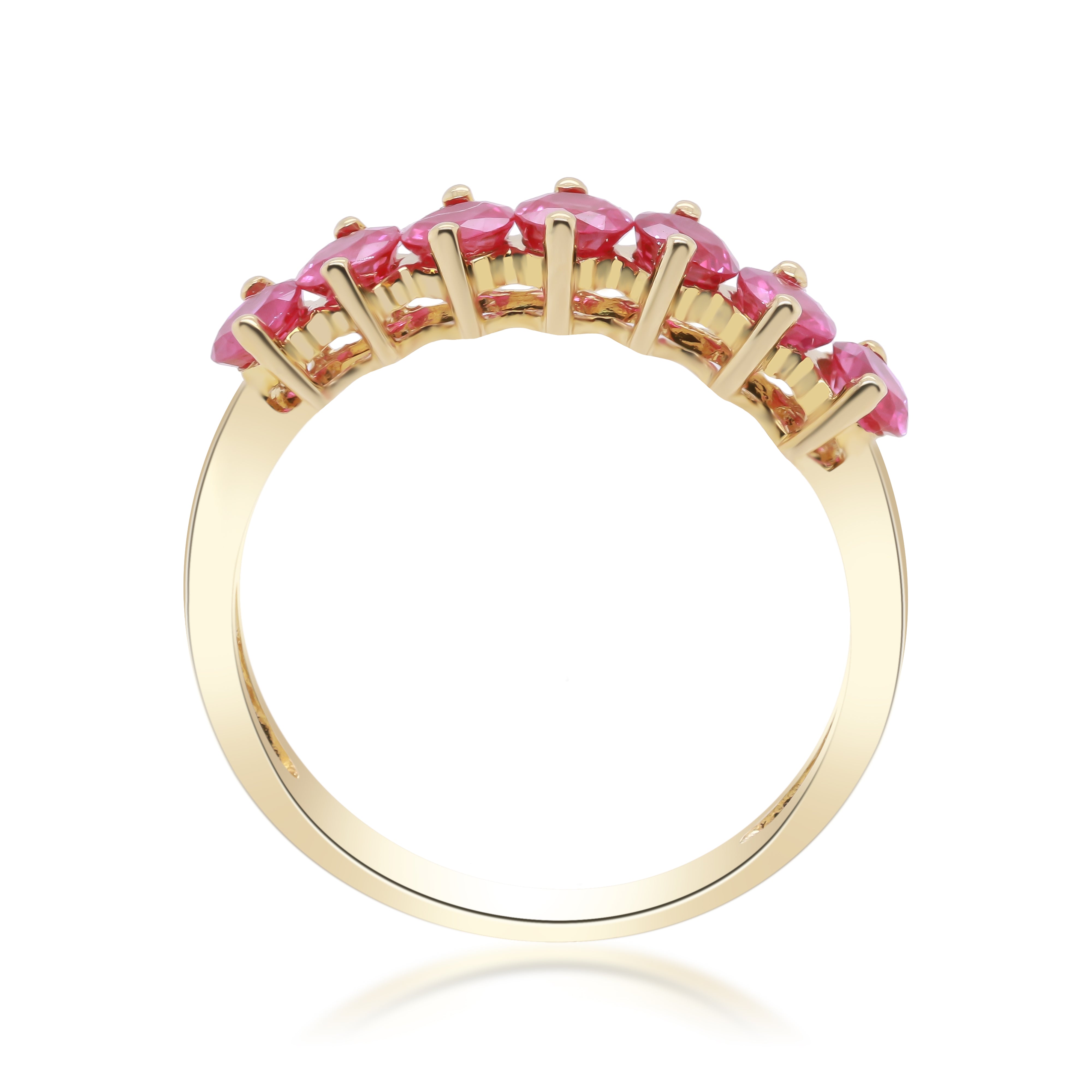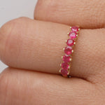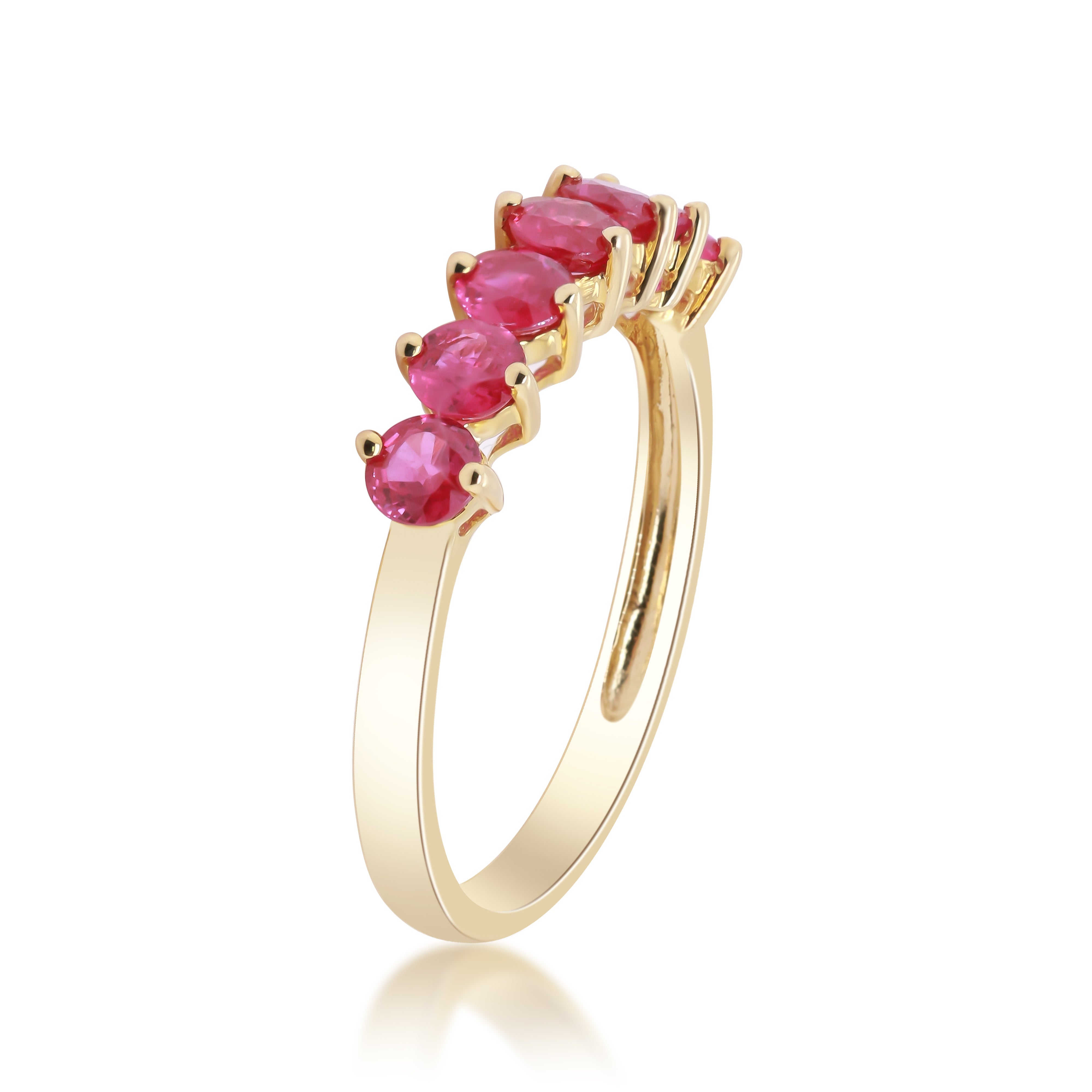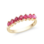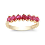 A row of shimmering round-cut Mozambique Rubies is prong-set across the front of this Gin & Grace ring. A highly polished finish completes the elegant look of this 14-karat yellow gold ring. Gemstone colors: Red Gemstone shapes: Round Seven prong-set round-cut rubies each measure 3 mm Total gemstone weight: 0.98 carats Metal: 14k yellow gold Finish: High polish Metal weight: 1.74 grams Ring setting dimensions: 18 mm wide x 3 mm long Band dimensions: 2 mm wide