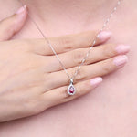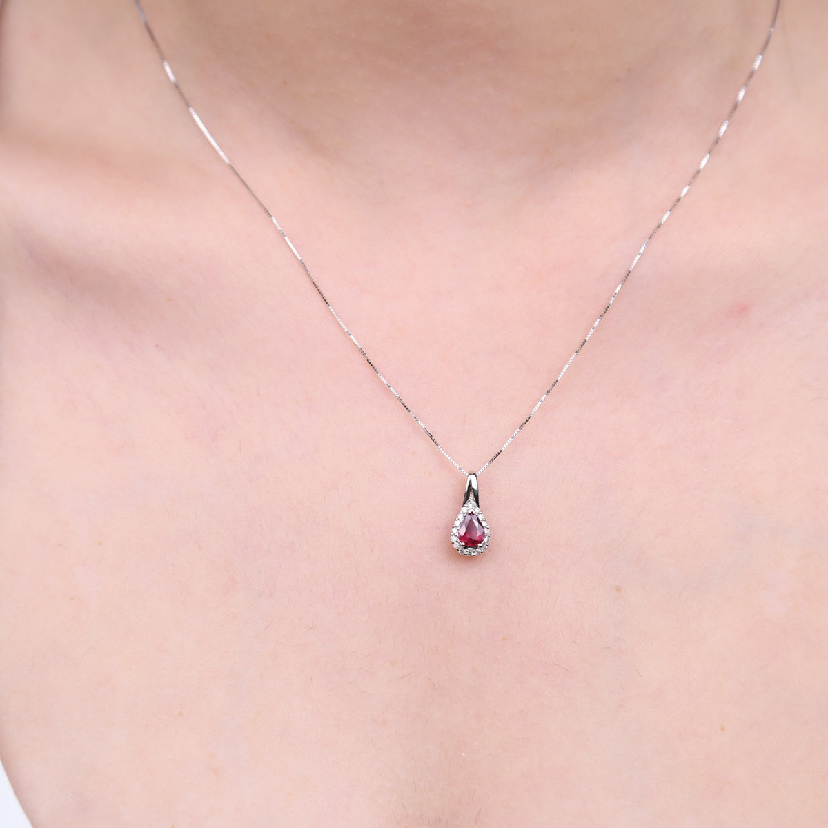 Stunning, timeless and classy eternity Unique Pendant. Decorate yourself in luxury with this Gin & Grace pendant. This pendant is made up of Pear-Cut Prong Setting Mozambique Ruby (1 pcs) 0.74 Carat and Round-Cut Prong Setting Diamond (16 pcs) 0.17 Carat accent stones for a lovely design. This Pendant is weight 0.86 grams. Crafted with 14k White Gold, this delicate Pendant is polished to a high finish shine.  This Pendant is made up of 5*7 mm Mozambique Ruby pear-cut (1 pcs )