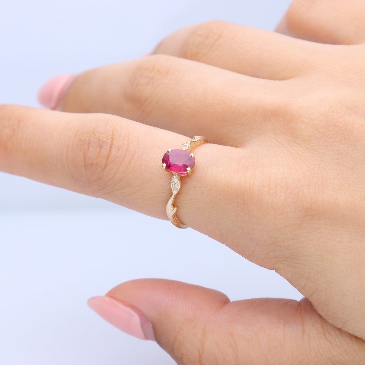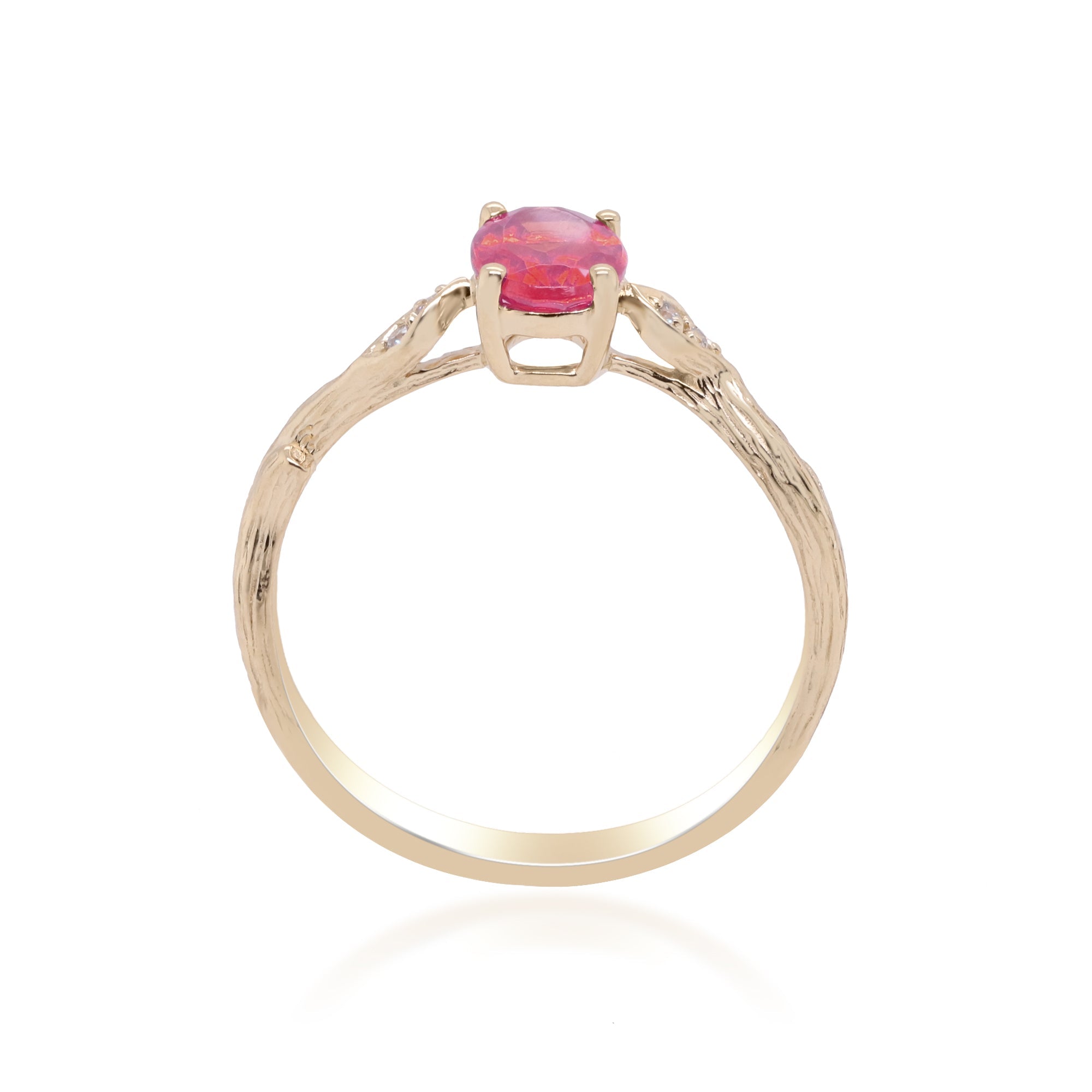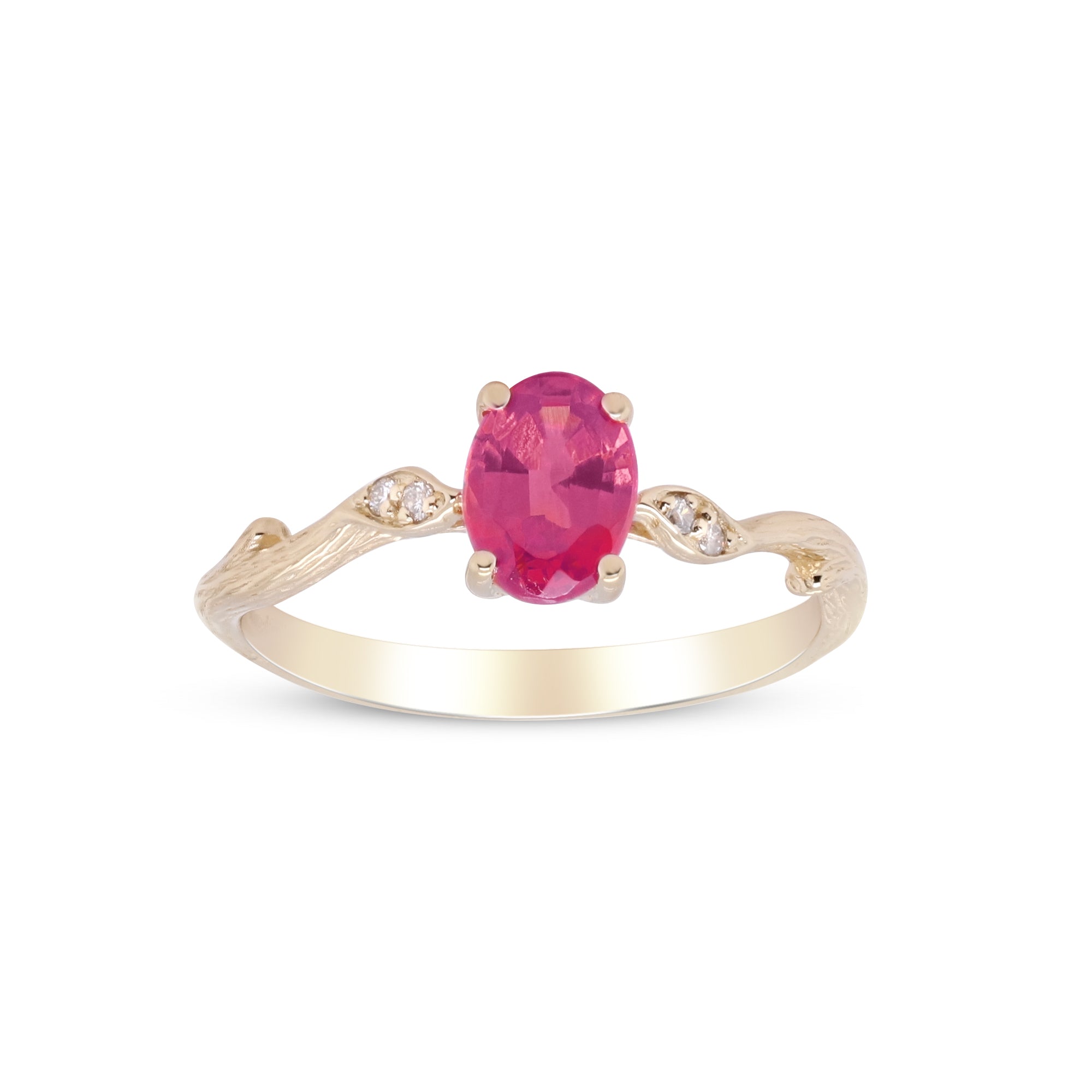 Stunning, timeless and classy eternity Unique ring. Decorate yourself in luxury with this Gin & Grace ring. The 14k Yellow Gold jewelry boasts Oval-Cut Prong Setting Natural Mozambique Ruby (1 pcs) 1.02 Carat and Round-Cut Prong Setting Natural Diamond (4 pcs) 0.03 Carat accent stones for a lovely design. This ring is weight 1.78 grams. Crafted with 14k Yellow Gold, this delicate Ring is polished to a high finish shine.