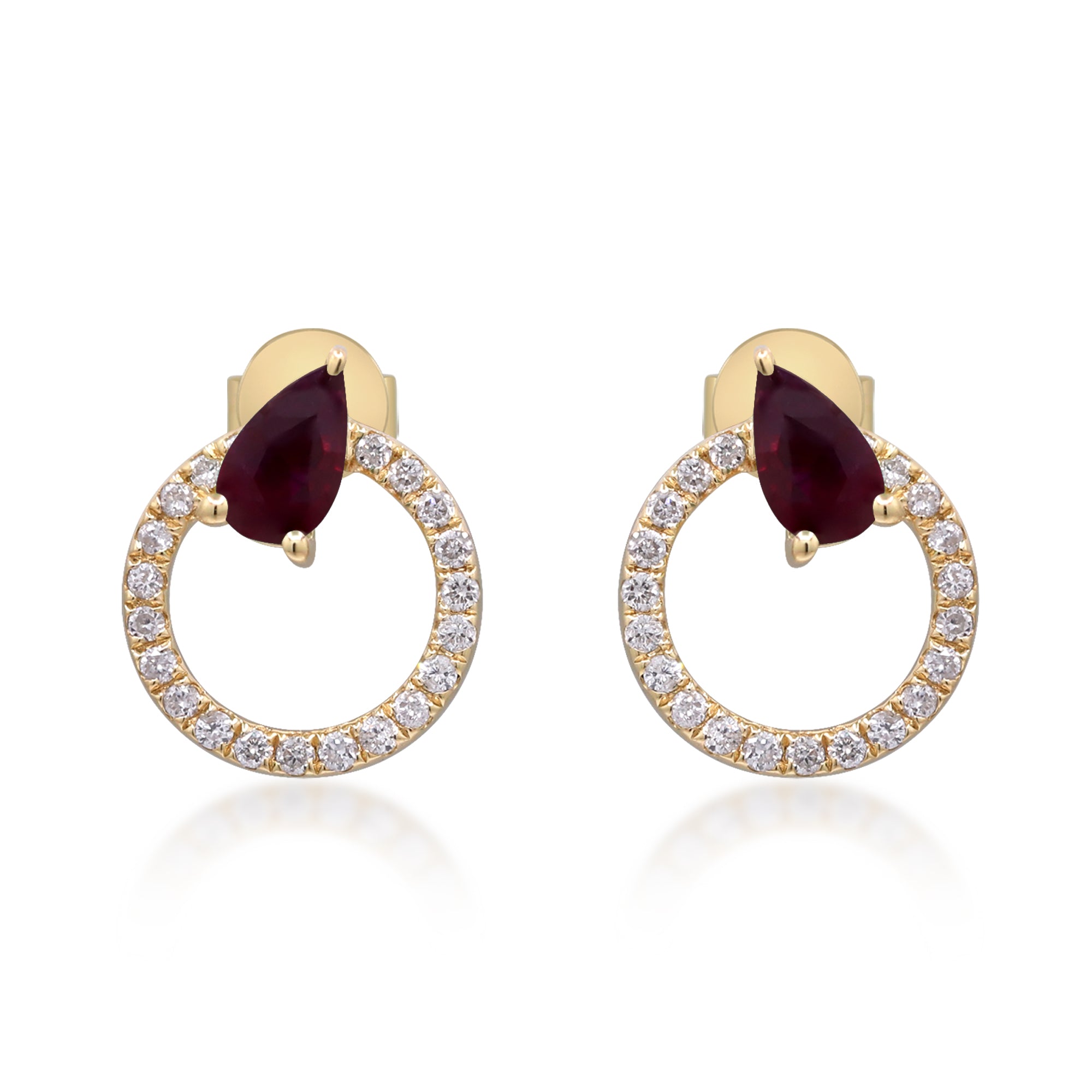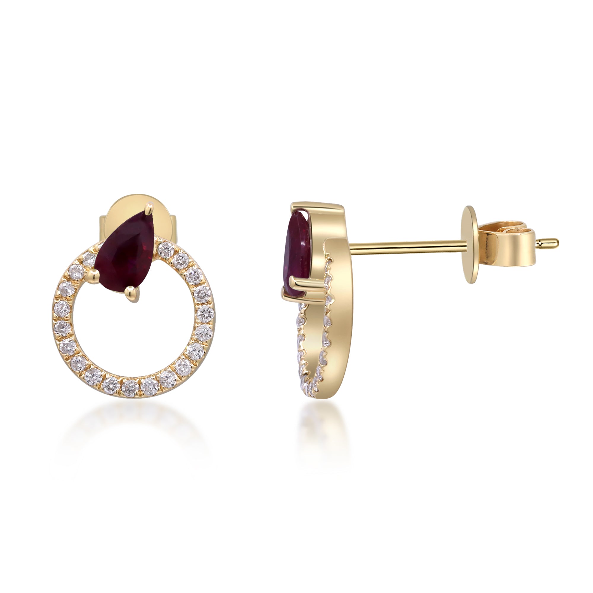 Decorate yourself in elegance with this Earring is crafted from 14K Yellow Gold by Gin & Grace Earring. The jewelry boasts Pear-Cut prong setting Mozambique Ruby (2 pcs) 0.43 Carat and Round-Cut prong setting Diamond (40 pcs) 0.15 Carat. This Earring is weight 1.54 grams. This delicate Earring is polished to a high finish shine. Simple Stud clasps keep these earrings securely fastened.