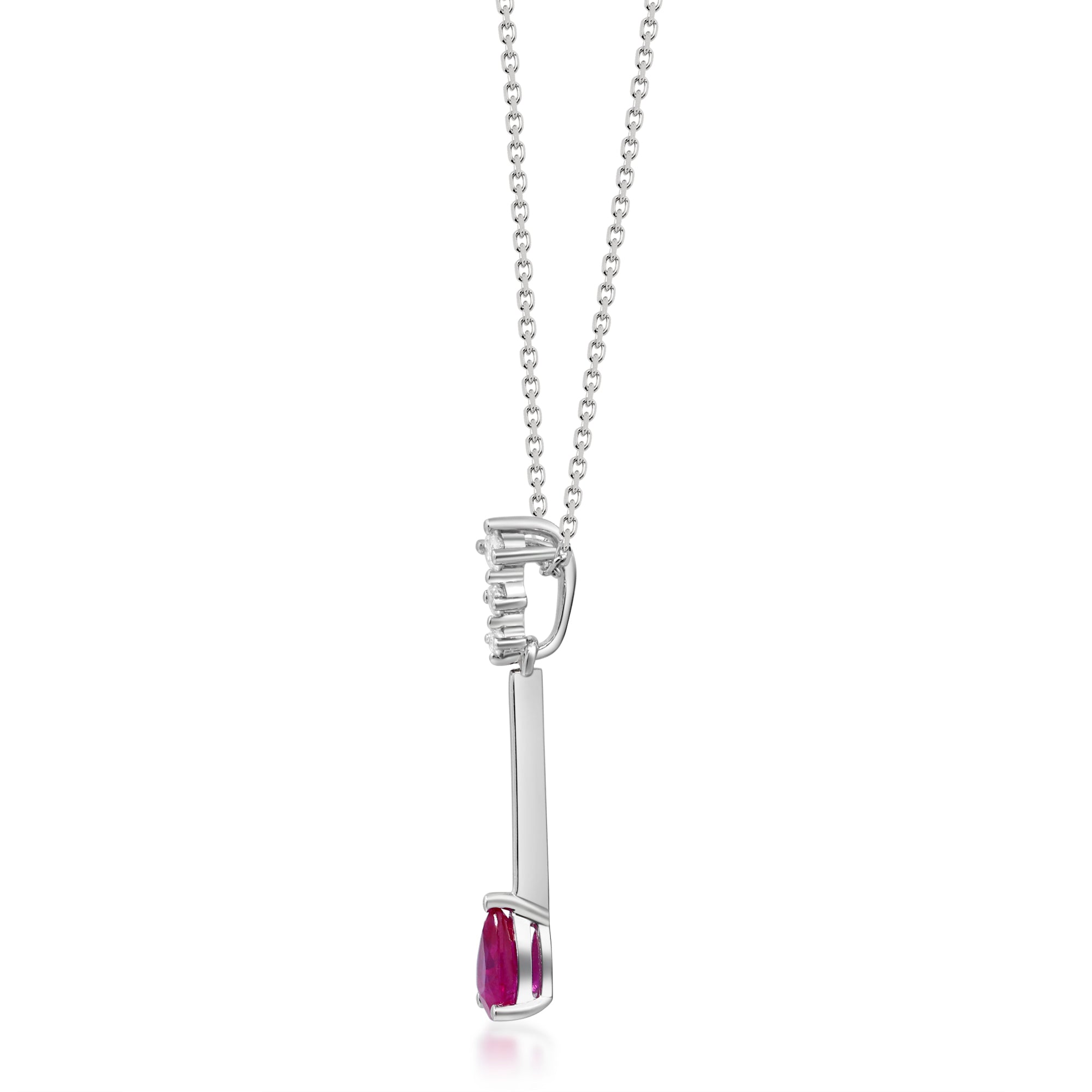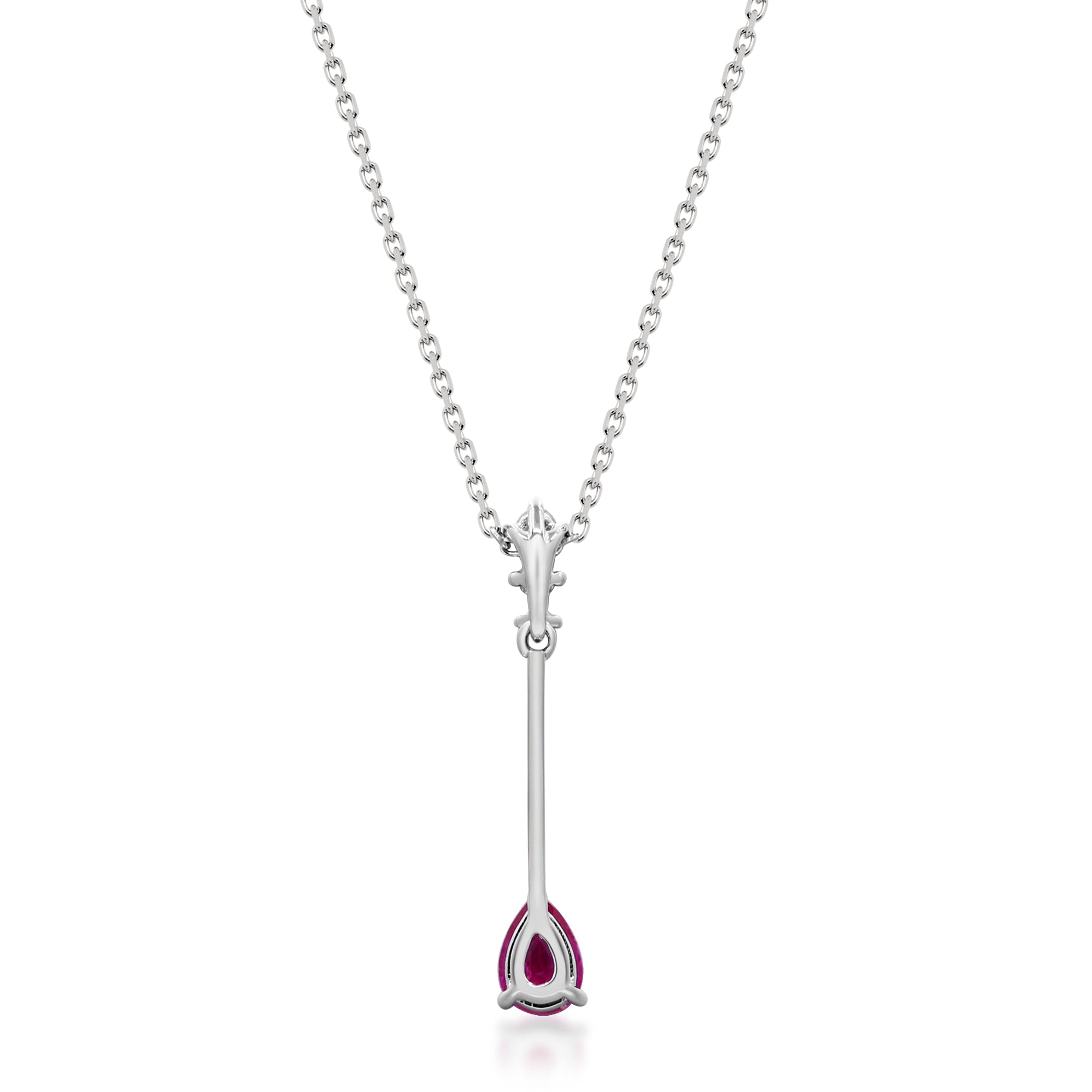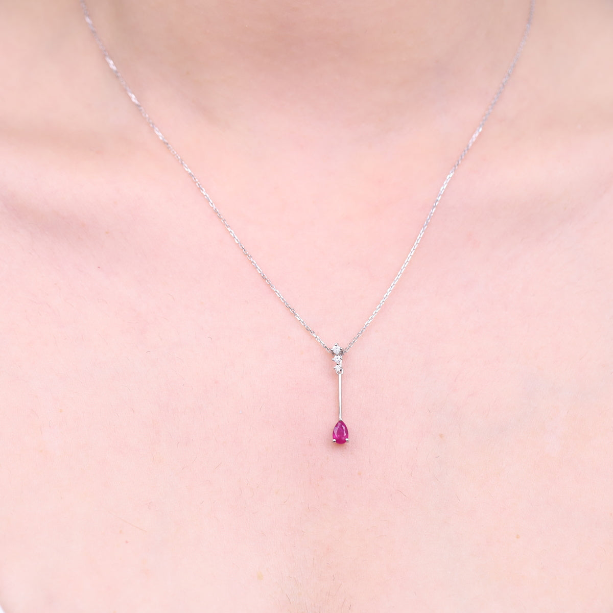 Decorate yourself in elegance with this Necklace is crafted from 10-karat White Gold by Gin & Grace Necklace. This Necklace is made up of 6x4 mm Pear-Cut Mozambique Ruby (1 Pcs) 0.43 Carat and Round-cut White Diamond (3 Pcs) 0.08 Carat. This Necklace is weight 1.94 grams. This delicate Necklace is polished to a high finish shine.