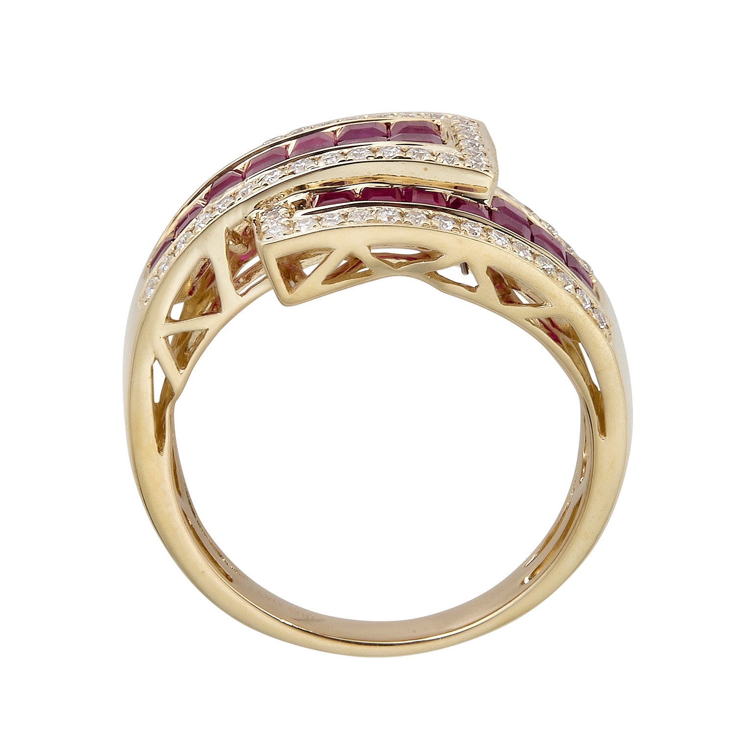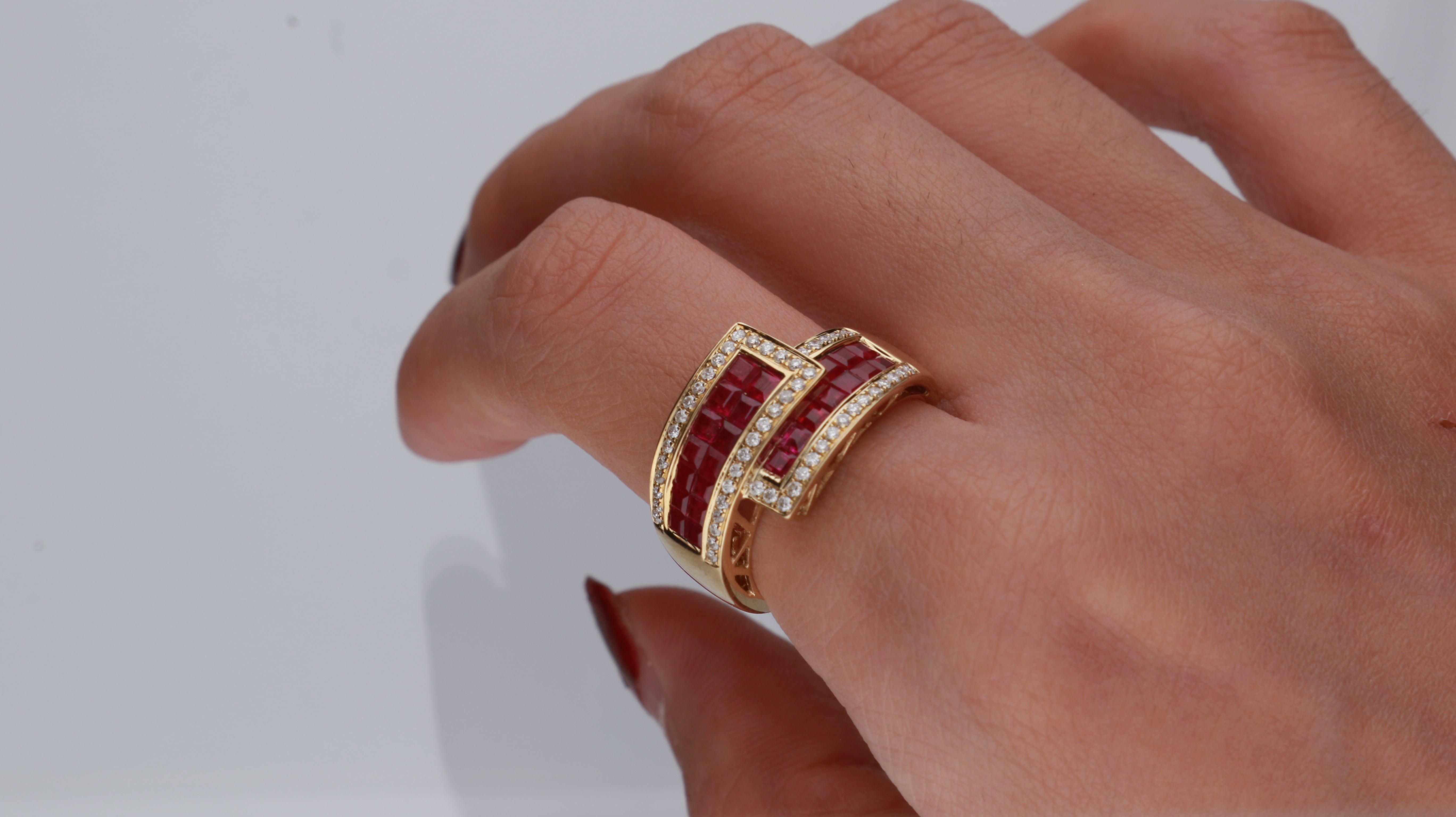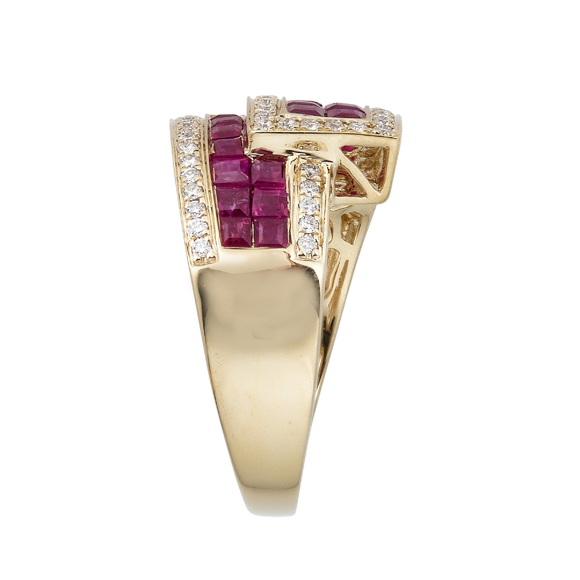 Stunning, timeless and classy eternity Unique ring. Decorate yourself in luxury with this Gin & Grace ring. This ring is made up of Square-Cut Invisible Setting Genuine Mozambique Ruby (24 pcs) 1.68 Carat and Round-Cut Prong Setting Natural Diamond (53 pcs) 0.27 Carat accent stones for a lovely design. This ring is weight 4.60 grams. The ring is crafted of shining 10-karat Yellow Gold and is completed by a highly polished finish.