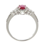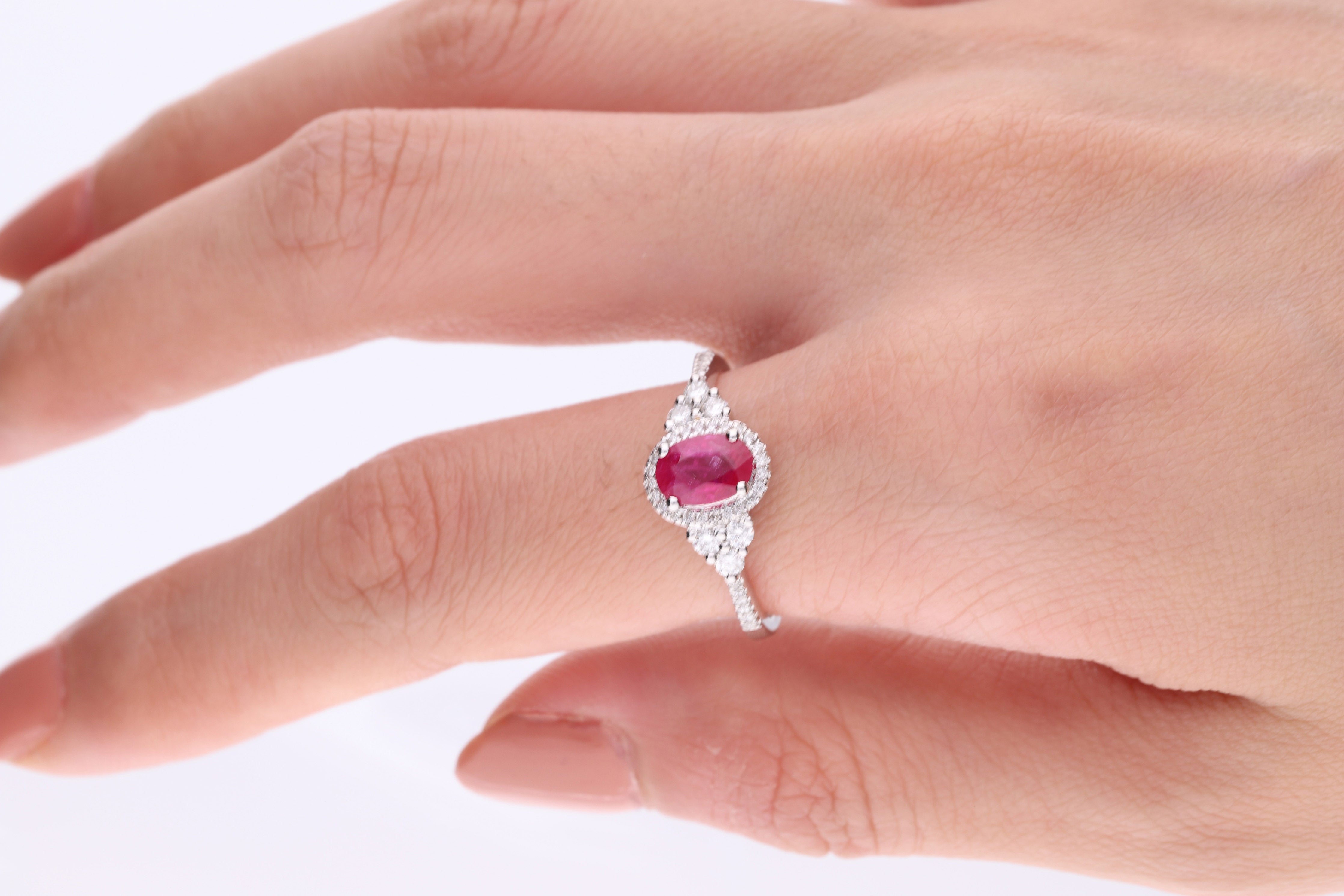Stunning, timeless and classy eternity Unique ring. Decorate yourself in luxury with this Gin & Grace ring. The 14K White Gold jewelry boasts Oval-Cut Prong Setting Genuine Mozambique Ruby (1 pc) 0.83 Carat, Round- Shape Natural Diamond (42 Pcs) 0.33 Carat accent stones for a lovely design. This ring weighs 2.52 grams. Crafted with 14K White Gold, this delicate Ring is polished to a high finish shine.