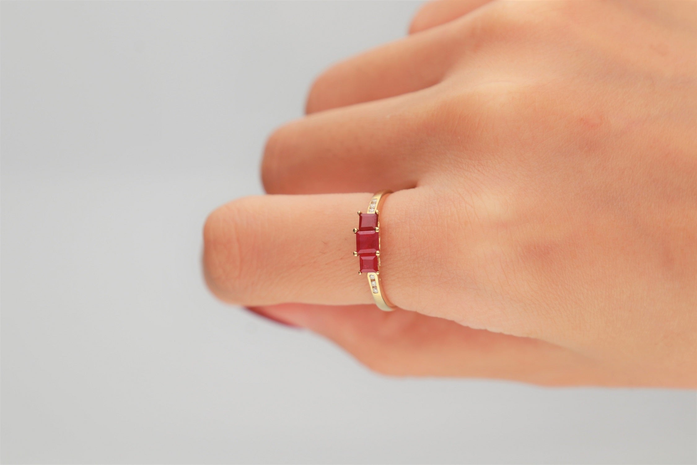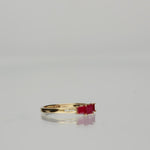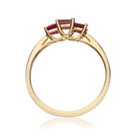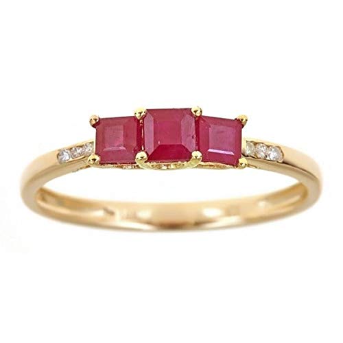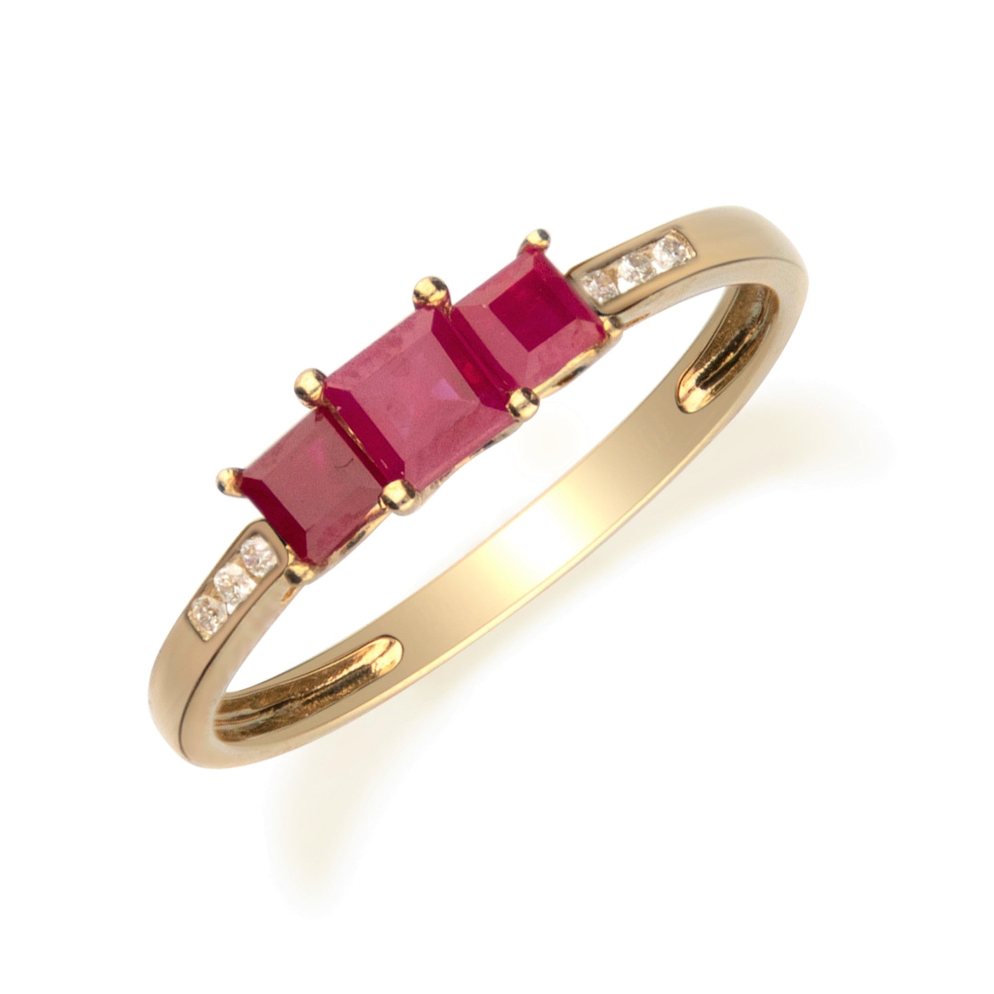A trio of Gin & Grace Genuine rubies in square cuts adorns this pretty ring, accentuated by white diamonds set to either side. The ring is crafted of 10-karat yellow gold and shines with a highly polished finish. Gemstone colors: Red Gemstone shapes: Round One prong-set square-cut Mozambique Ruby measures 3.5 mm wide x 3.5 mm long Gemstone weight: 0.32 carat Two prong-set square-cut rubies each measure 3 mm wide x 3 mm long Gemstone weight: 1/2 carat Total gemstone weight: 0.46 carat Diamonds: Six Diamond cut: Round Diamond measurements: 1 mm Diamond weight: 0.04 carat Color: G-H Clarity: I1-I2 Setting: Channel Metal: 10k yellow gold Finish: High polish Metal weight: 1.44 grams Ring setting dimensions: 15 mm wide x 4 mm long Band dimensions: 2 mm wide