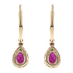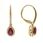 Decorate yourself in elegance with this Earring is crafted from 10-karat Yellow Gold by Gin & Grace. This Earring is made up Pear-cut Ruby (2 pcs) 0.95 carat and Round-cut White Diamond (52 Pcs) 0.17 Carat. This Earring is weight 1.42 grams. This delicate Earring is polished to a high finish shine.