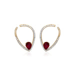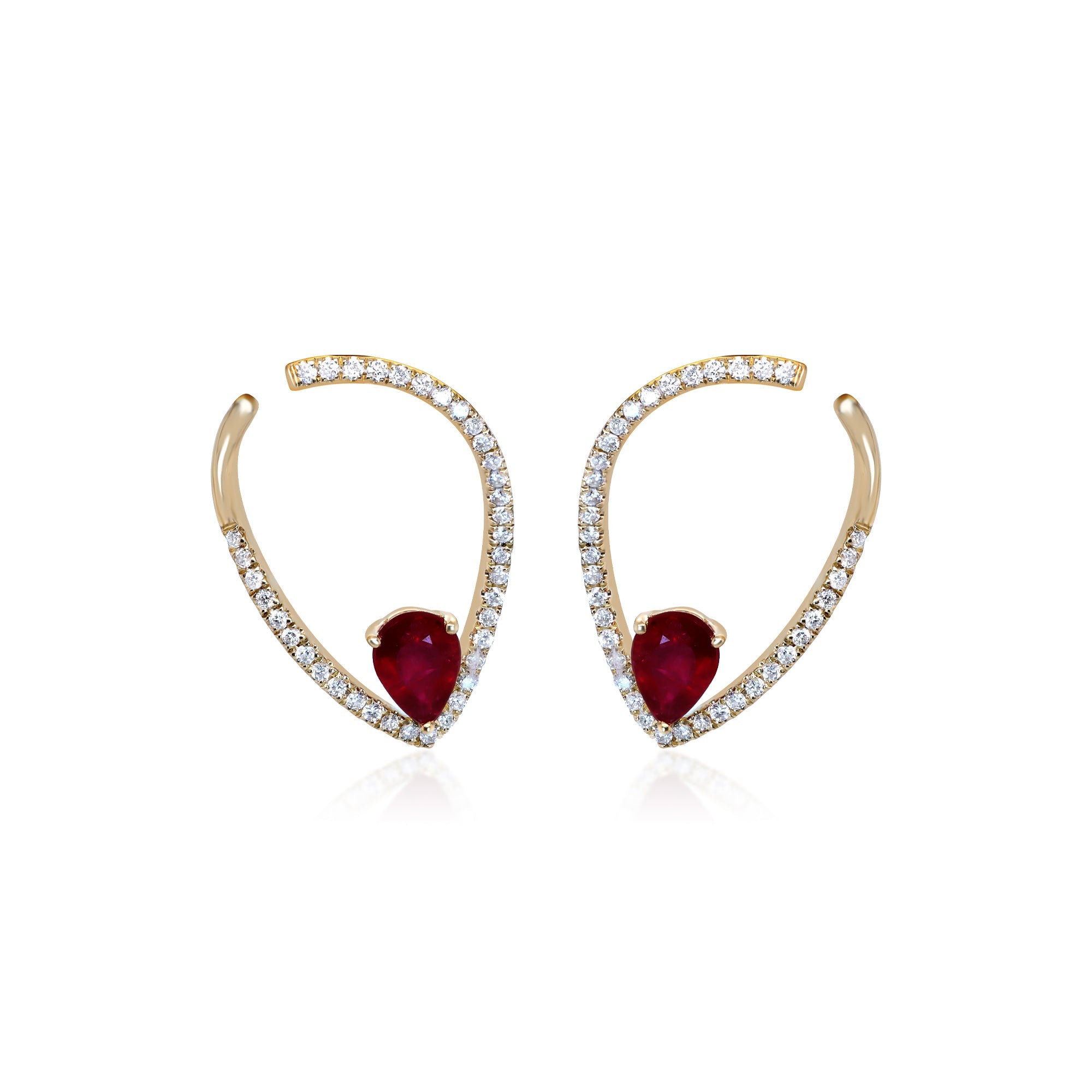 ecorate yourself in elegance with this Earring is crafted from 10-karat Yellow Gold by Gin & Grace Earring. This Earring is made up of 6x4 mm Pears-Cut Mozambique Ruby (2 pcs) 0.82 carat and Round-cut White Diamond (76 Pcs) 0.28 Carat. This Earring is weight 2.43 grams. This delicate Earring is polished to a high finish shine.