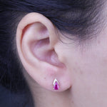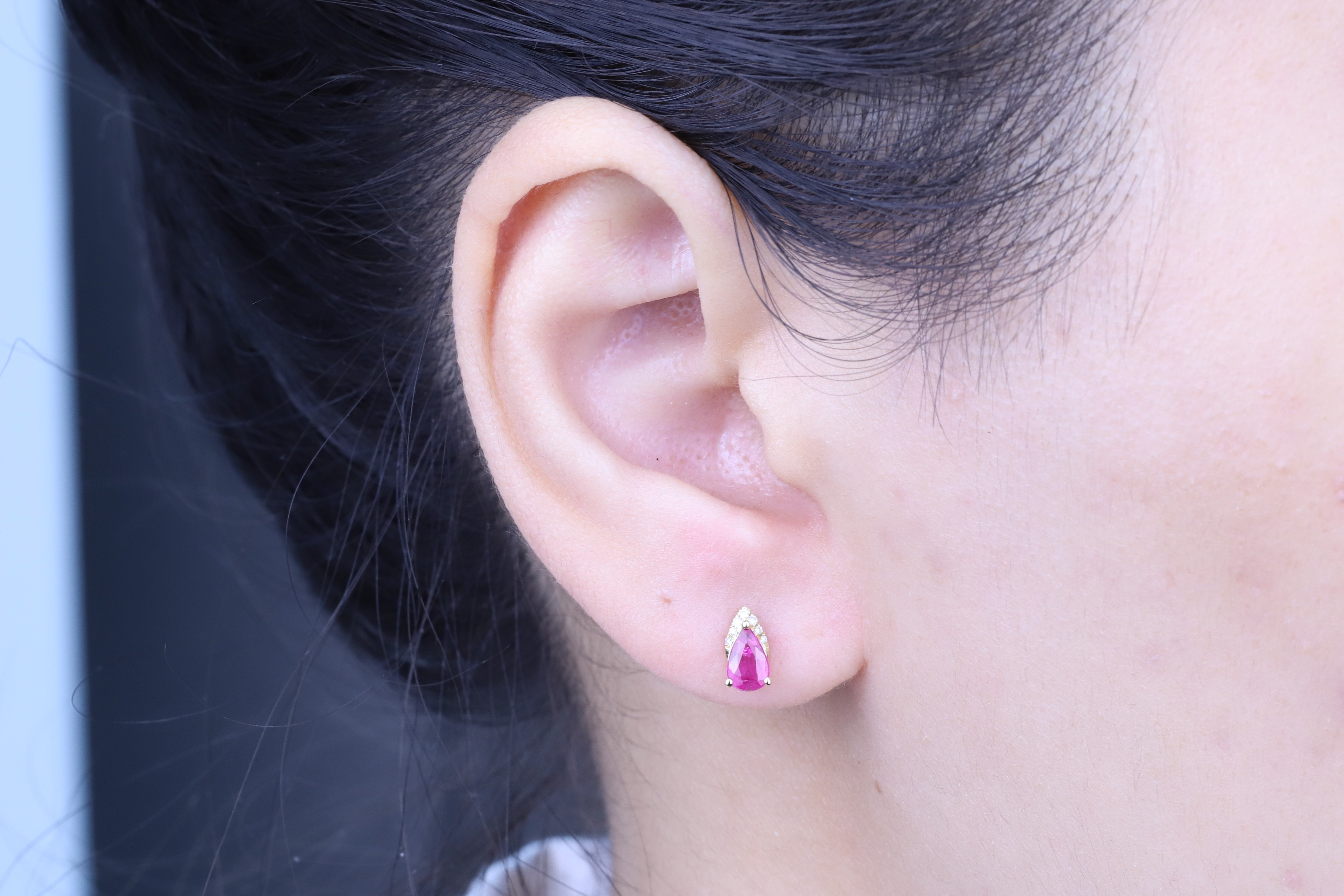 Decorate yourself in elegance with this Earring is crafted from 10-karat Yellow Gold by Gin & Grace Earring. This Earring is made up of 6x4 mm Pears-Cut Mozambique Ruby (2 pcs) 0.89 carat and Round-cut White Diamond (14 Pcs) 0.04 Carat. This Earring is weight 0.88 grams. This delicate Earring is polished to a high finish shine.