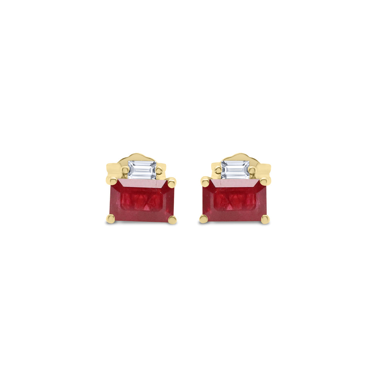 Decorate yourself in elegance with this Earring is crafted from 14-karat Yellow Gold by Gin & Grace. This Earring is made up of Emerald-Cut Mozambique Ruby (2 pcs) 1.33 carat and Round-cut Diamond (2 pcs) 0.13 Carat. This Earring is weight 1.07 grams. This delicate Earring is polished to a high finish shine.