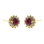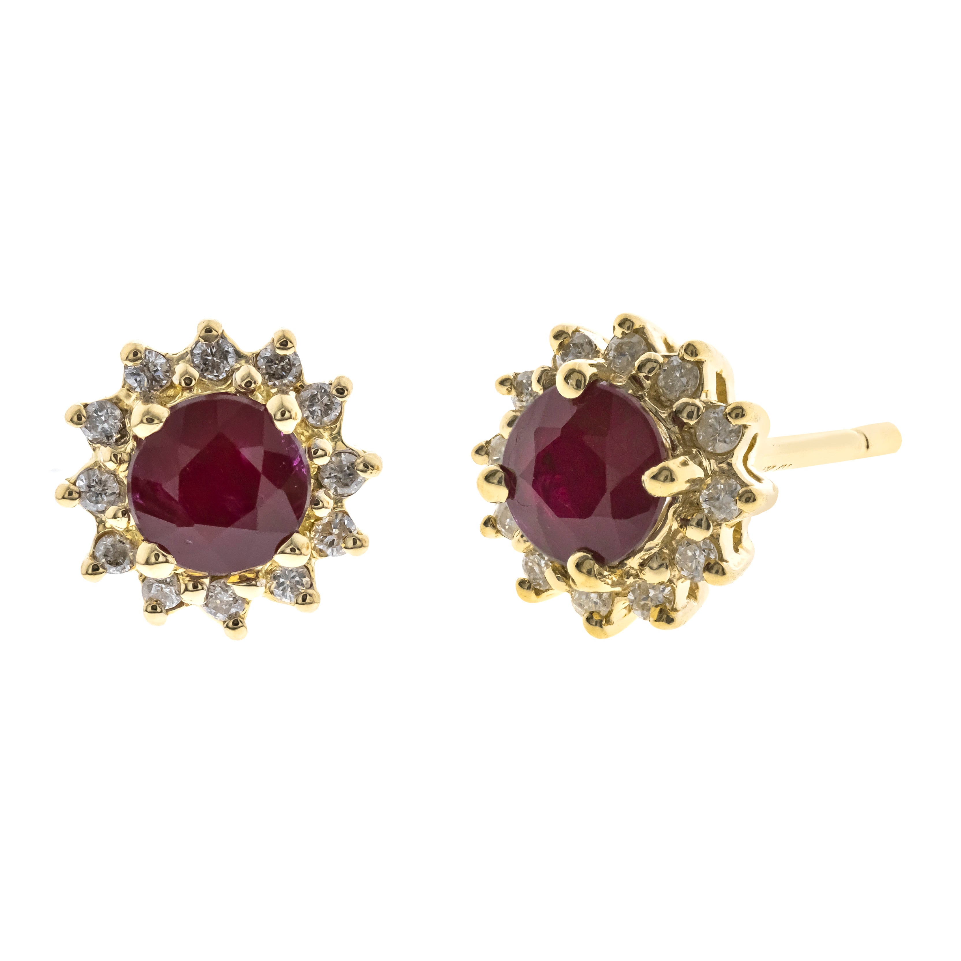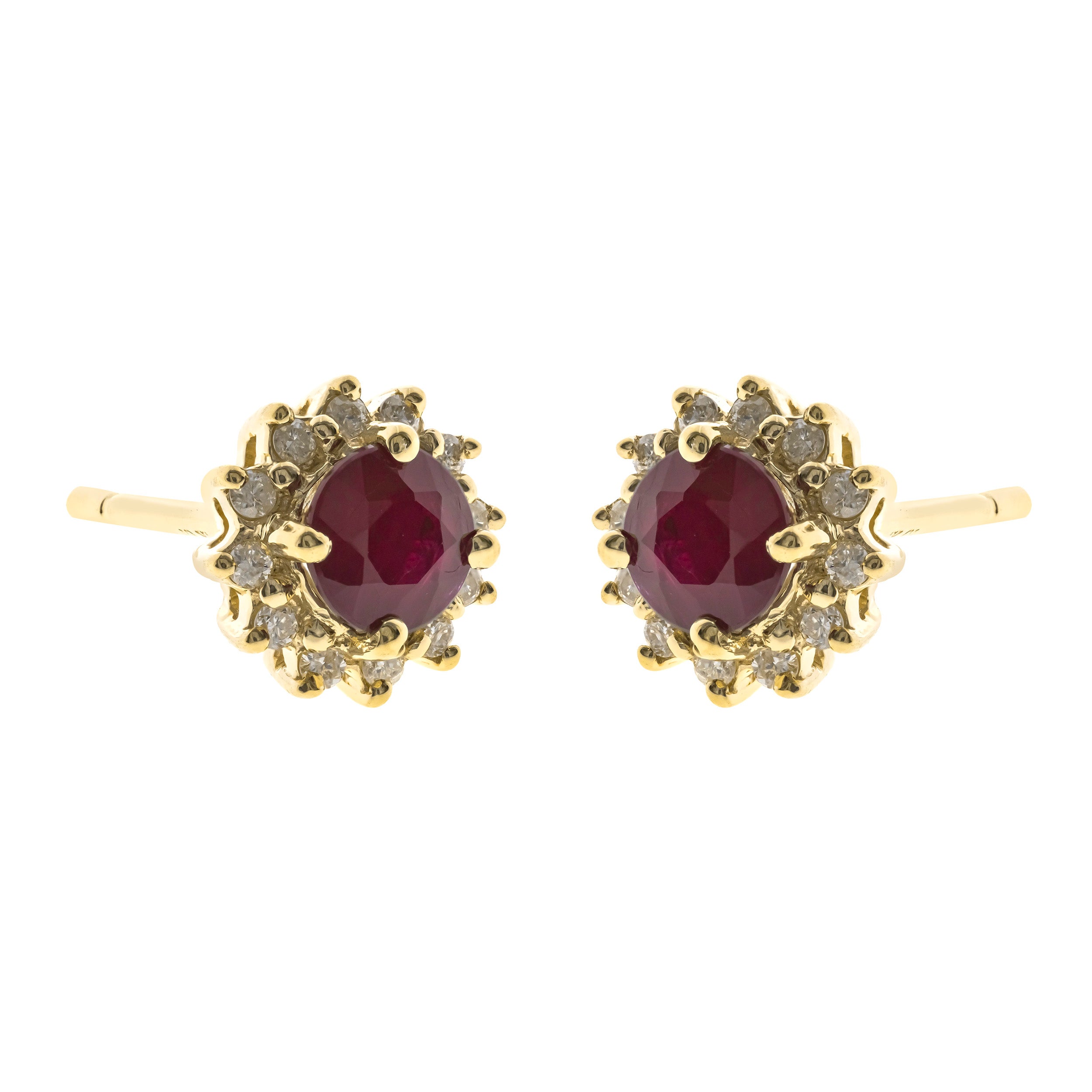 Decorate yourself in elegance with this Earring is crafted from 14K Yellow Gold by Gin & Grace. This Earring is made up round-cut ruby (2 pcs) 0.85 carat and Round-cut White Diamond (24 Pcs) 0.13 Carat. This Earring is weight 1.76 grams. This delicate Earring is polished to a high finish shine.
