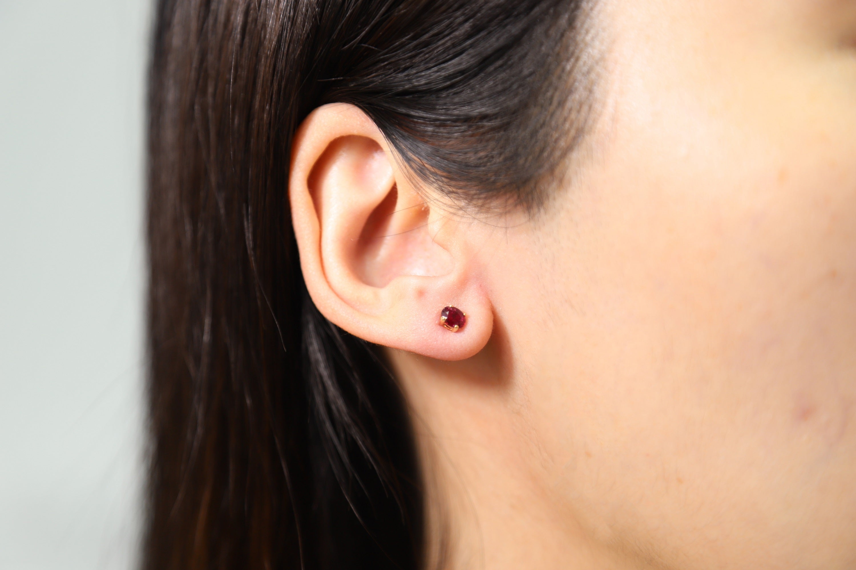 Decorate yourself in elegance with this Earring is crafted from 14-karat Yellow Gold by Gin & Grace Earring. The jewelry boasts Round-Cut prong setting Mozambique Ruby (2 pcs) 0.86 Carat and Round-Cut prong setting Carat. This Earring is weight 0.69 grams. This delicate Earring is polished to a high finish shine. Simple Stud clasps keep these earrings securely fastened.