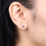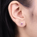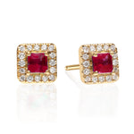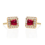 Decorate yourself in elegance with this Earring is crafted from 10-karat Yellow Gold by Gin & Grace Earring. This Earring is made up of 3.0 mm Square-Cut Mozambique Ruby (2Pcs) 0.38 Carat and Round-cut White Diamond (32 Pcs) 0.12 Carat. This Earring is weight 1.07 grams. This delicate Earring is polished to a high finish shine.