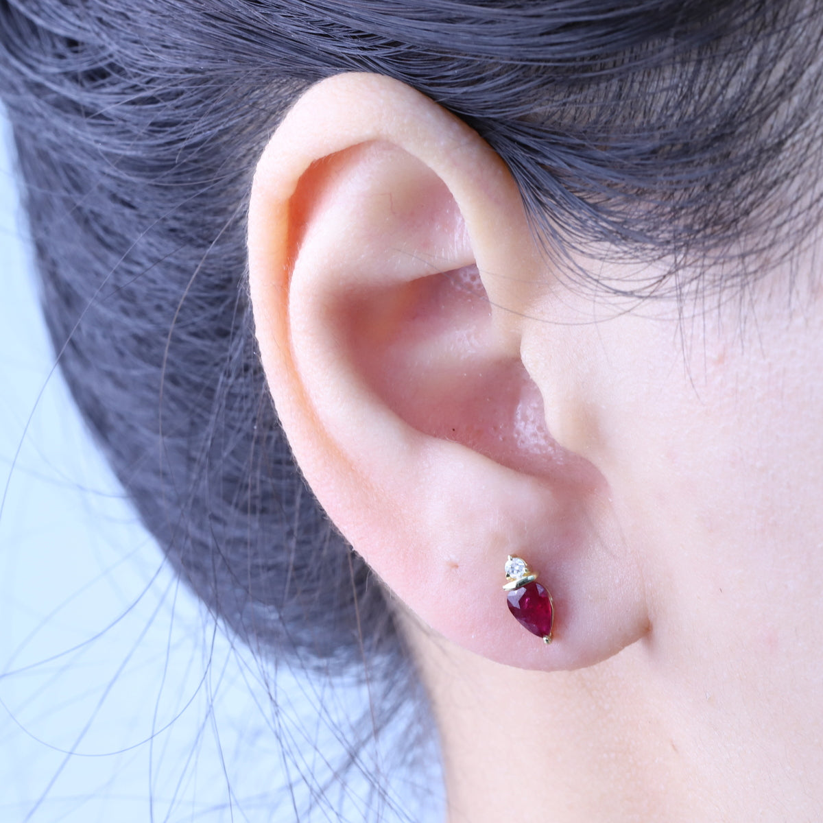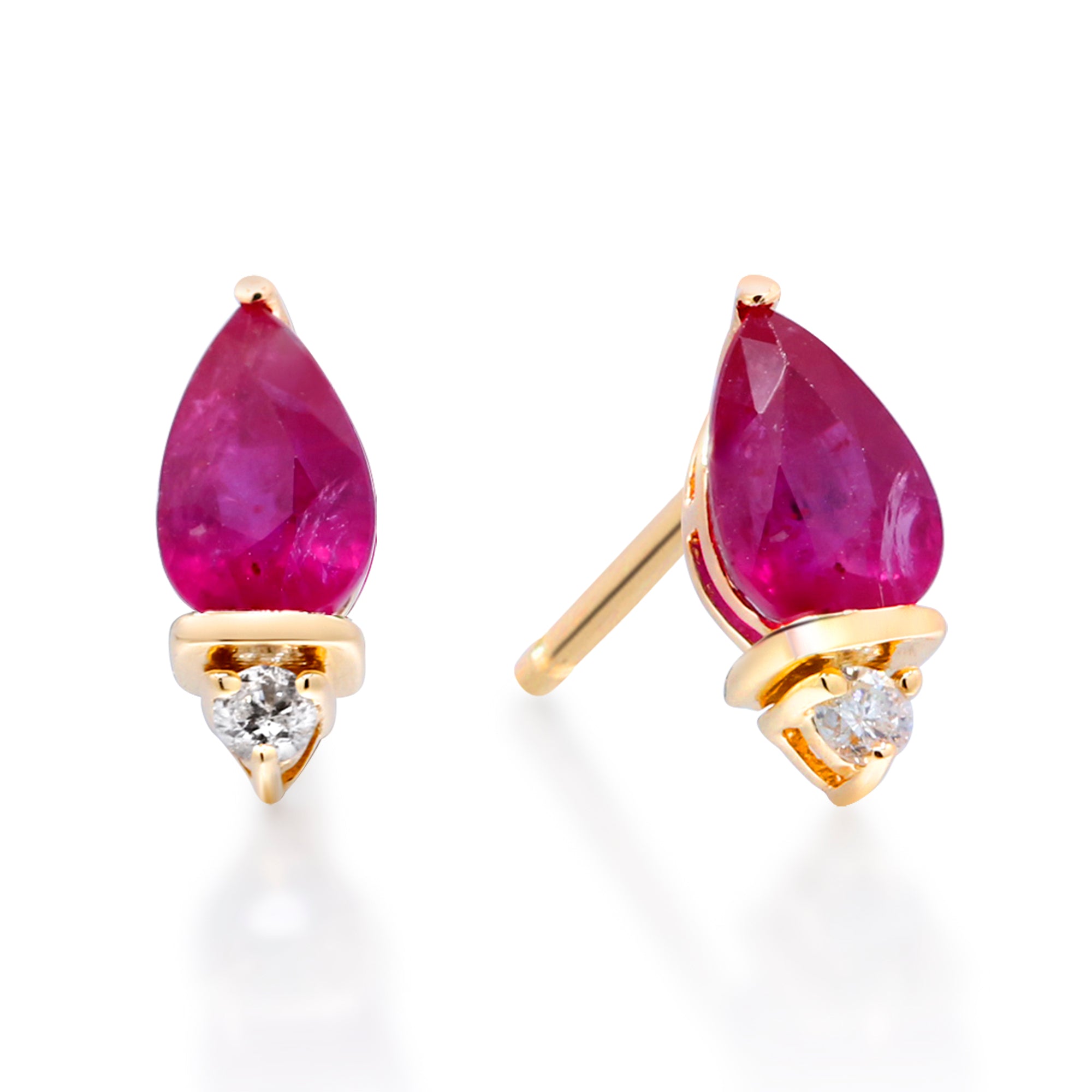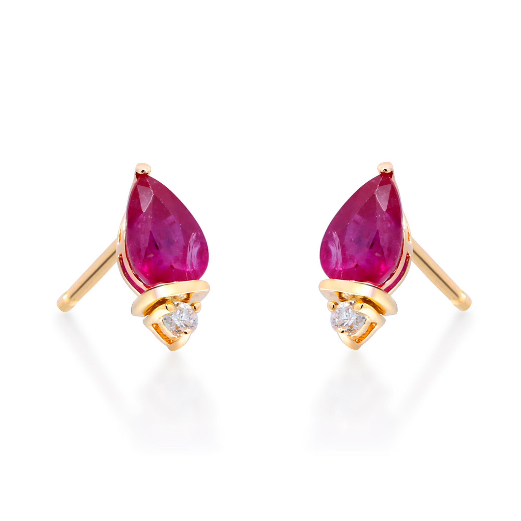 Decorate yourself in elegance with this Earring is crafted from 10-karat Yellow Gold by Gin & Grace. This Earring is made up of Pear-Cut Mozambique Ruby (2 pcs) 0.85 carat and Round-cut White Diamond (2 Pcs) 0.05 Carat. This Earring is weight 0.87 grams. This delicate Earring is polished to a high finish shine.