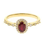 Decorate yourself in elegance with this Ring is crafted from 10-karat Yellow Gold by Gin & Grace. This Ring is made up of 6x4 mm Oval-Cut (1 pcs) 0.55 carat Mozambique Ruby and Round-cut White Diamond (24 Pcs) 0.20 Carat. This Ring is weight 1.96 grams. This delicate Ring is polished to a high finish shine.