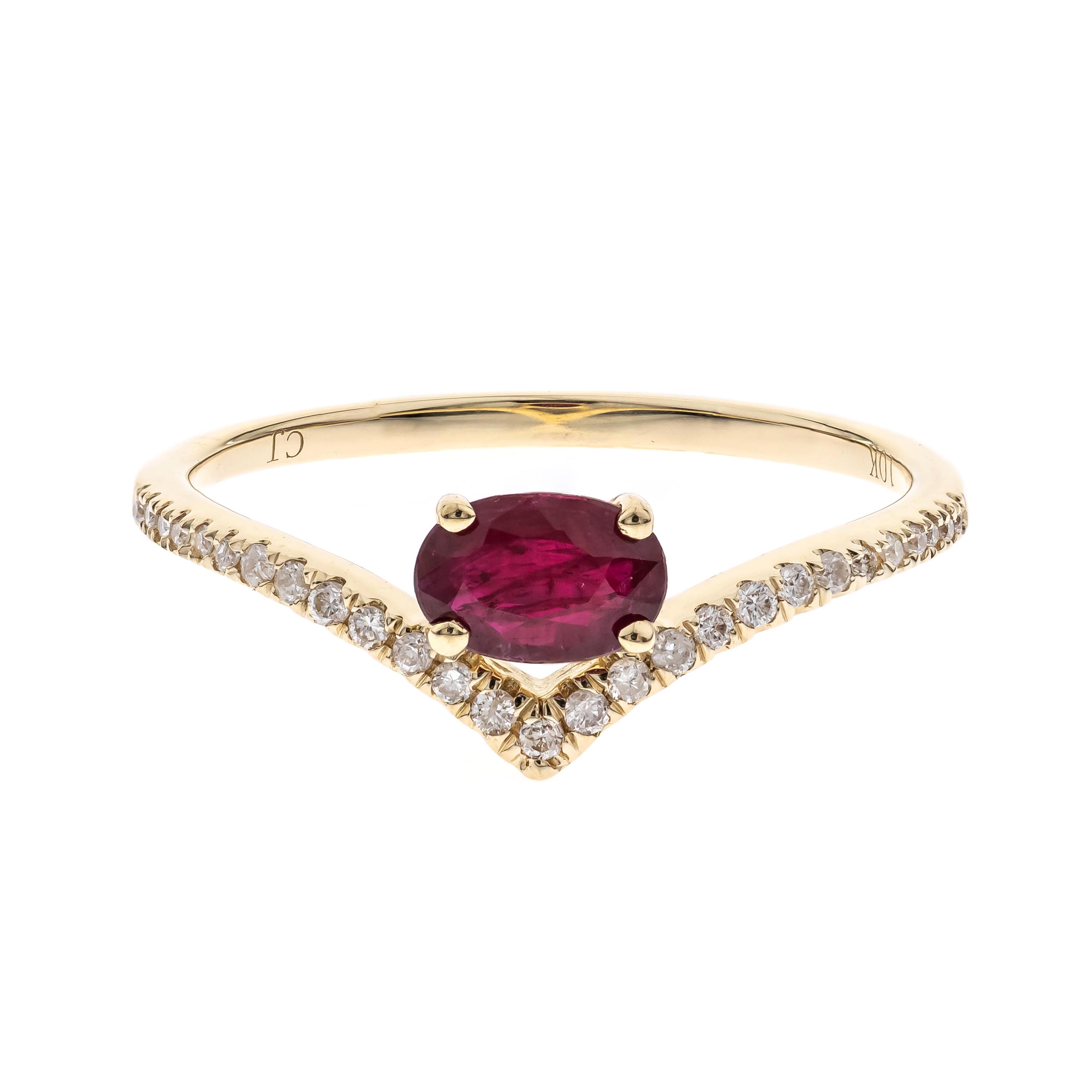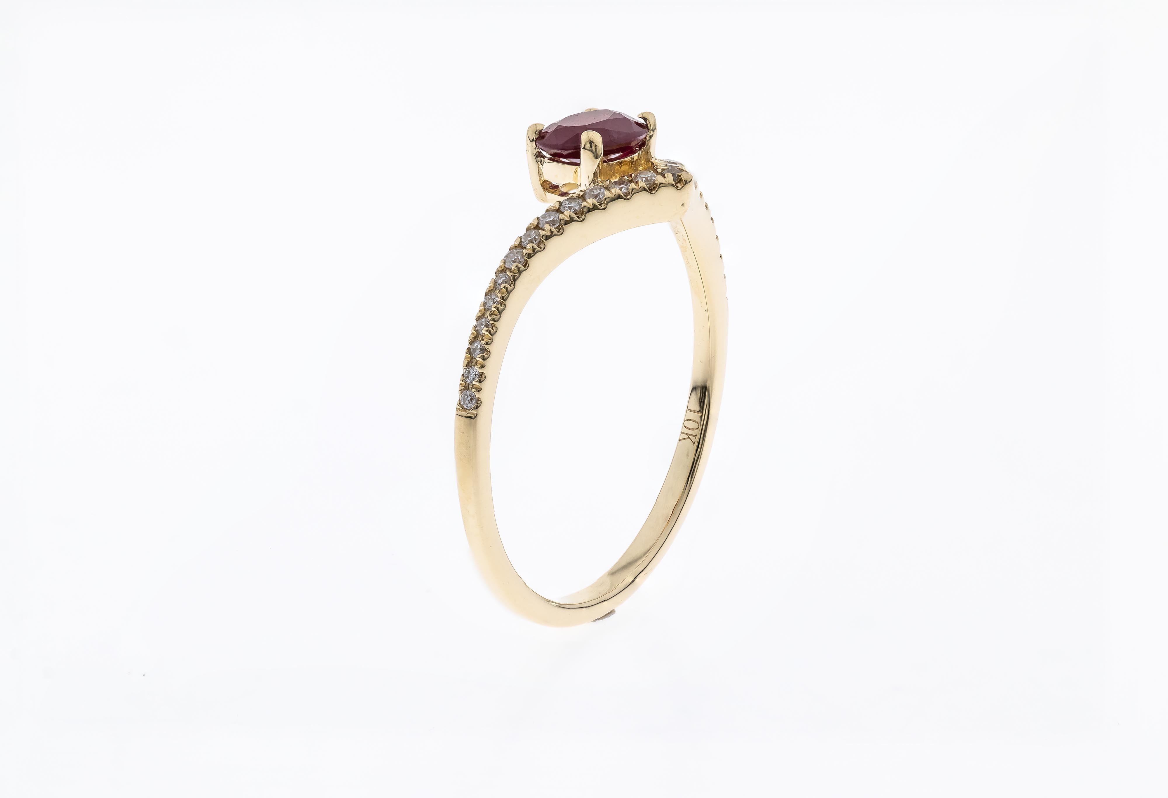 Stunning, timeless and classy eternity Unique ring. Decorate yourself in luxury with this Gin & Grace ring. This ring is made up of Oval-Cut Prong Setting Genuine Mozambique Ruby (1 pcs) 0.56 Carat and Round-Cut Prong Setting Diamond (27 pcs) 0.11 Carat accent stones for a lovely design. This ring is weight 1.35 grams. The ring is crafted of shining 10-karat Yellow Gold and is completed by a highly polished finish.Â