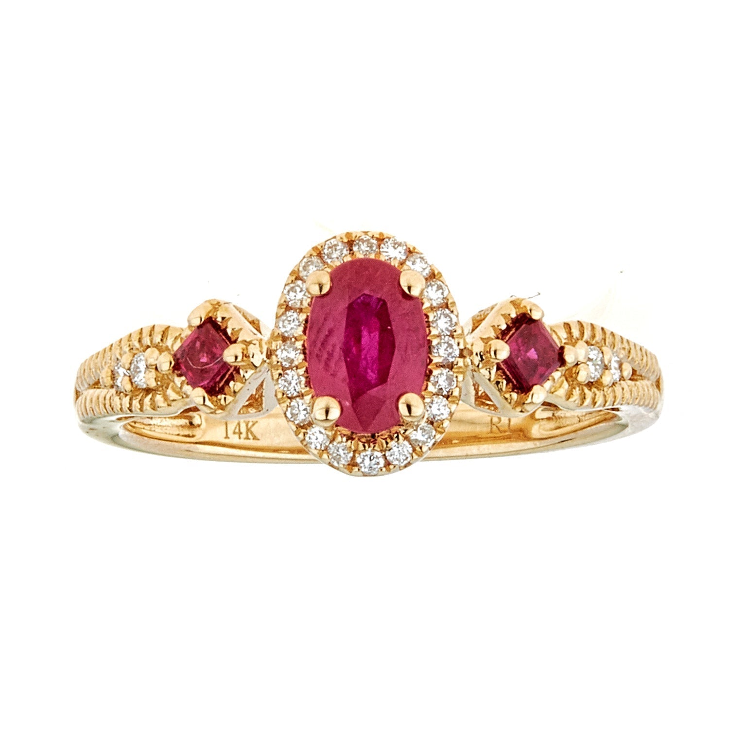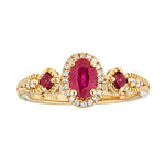 Decorate yourself in elegance with this Ring is crafted from 14-karat Yellow Gold by Gin & Grace. This Ring is made up of 6x4 mm Oval-Cut (1 pcs) 0.56 carat Mozambique Ruby, 2.0 mm Square-cut Mozambique Ruby (2 pcs) 0.12 carat and Ariana White Diamond (24 Pcs) 0.10 Carat. This Ring is weight 2.82 grams. This delicate Ring is polished to a high finish shine.