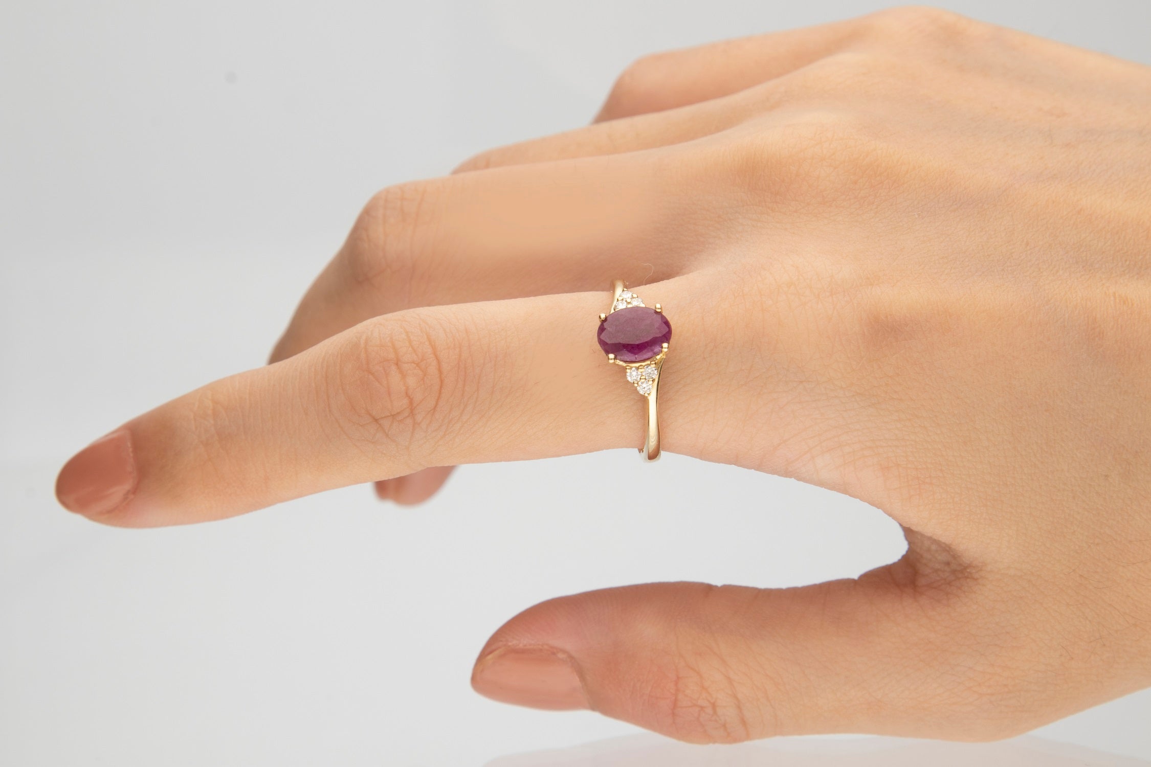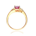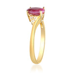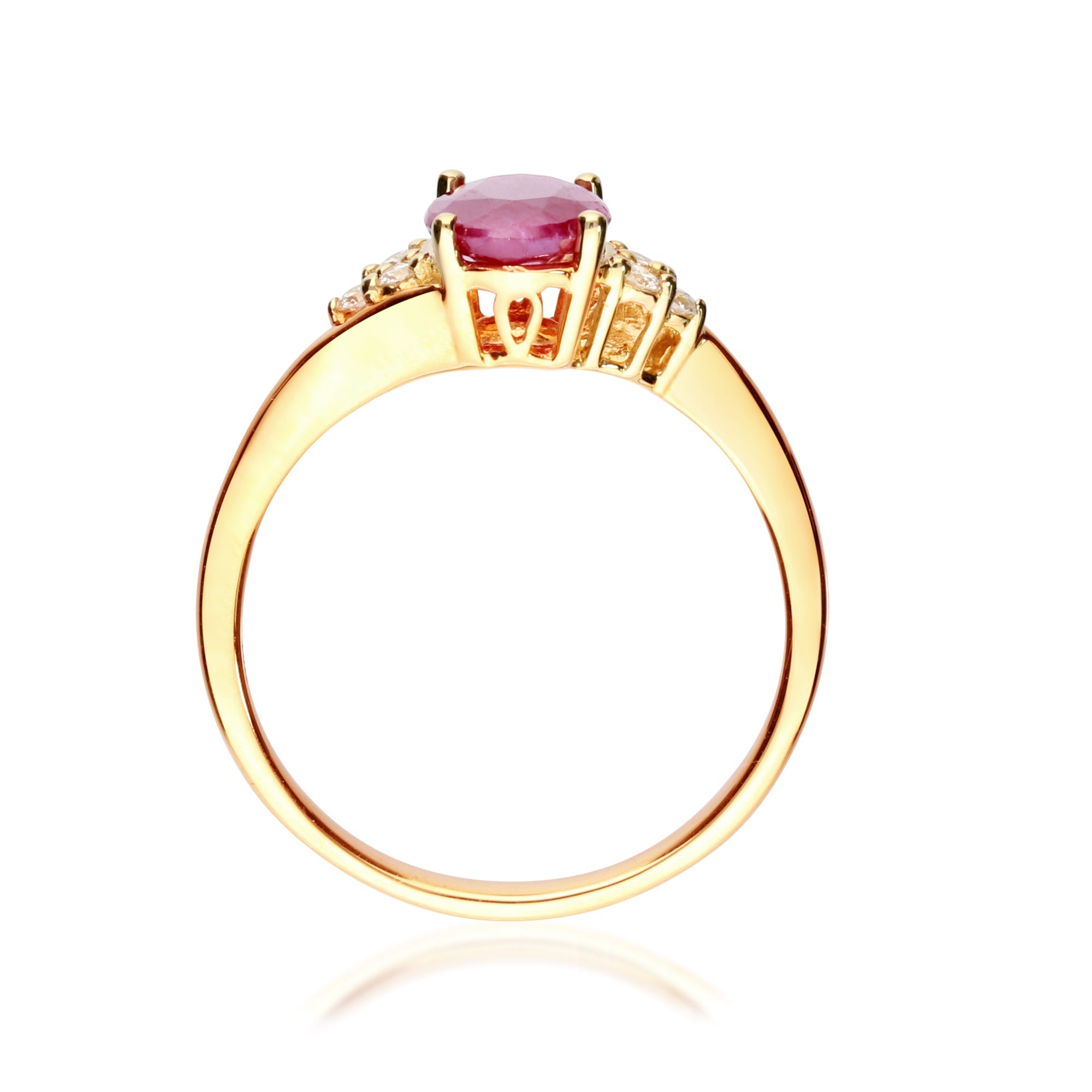 Ensure that your style can be admired from every angle with this ideal ornament The 10k yellow gold of this ring is highly polished and features Genuine Mozambique Ruby and 1/8 carat diamond stones for a dazzling design. Jewelry Type: Fine Stone Shape: Oval Band Width: 2-3 mm Clarity: I1-I2 Number of Gemstones: 1 Stone: Gemstone Diamond Color: G-H Side Stone: Diamond Gold Karat: 10k Gemstone Cut: Oval Total Diamond Weight: Less than .5 Carats Jewelry Setting: Prong Diamond Cut: Round Gender: Female Ring Style: Anniversary Gemstone Treatment Code: H Jewelry Finish: High Polish Gemstone: Genuine Mozambique Ruby Metal Color: Yellow Metal: Gold Gemstone Color: Red