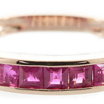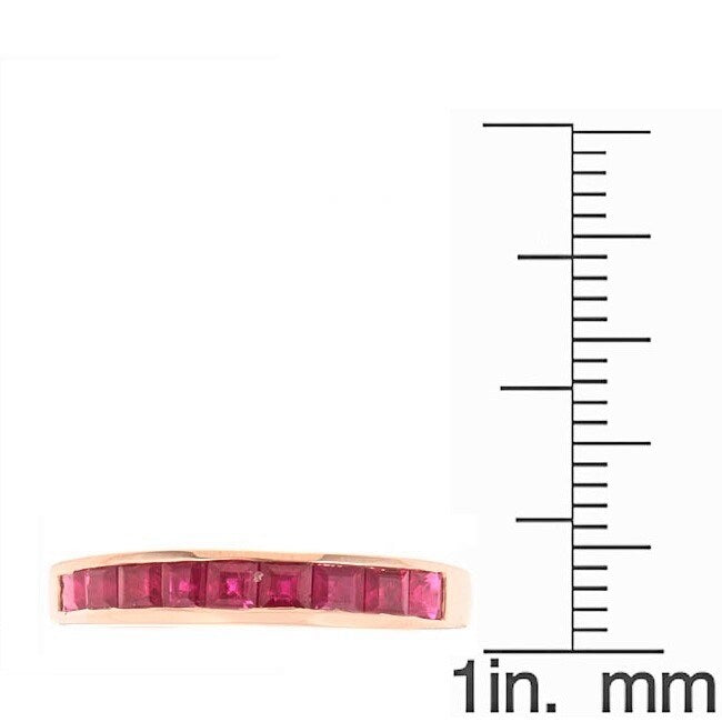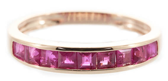 This ring features seven square-cut Thai rubies in a row in channel settings. The ring is crafted of 14-karat rose gold with a highly polished finish. Gemstone colors: Pink Gemstone shapes: Square Nine Channel-setting square-cut Thai rubies each measure 3 mm wide x 3 mm long Total gemstone weight: 0.91 carats Metal: 14k rose gold Finish: High polish Metal weight: 1.88 grams Ring setting dimensions: 19 mm wide x 3 mm long Band dimensions: 2 mm wide