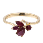 Decorate yourself in elegance with this Ring is crafted from 14K Yellow Gold by Gin & Grace. This Ring is made up of Pear-Cut Mozambique Ruby (4 pcs) 0.81 carat and Round-cut White Diamond (3 Pcs) 0.02 Carat. This Ring is weight 1.71 grams. This delicate Ring is polished to a high finish shine.