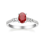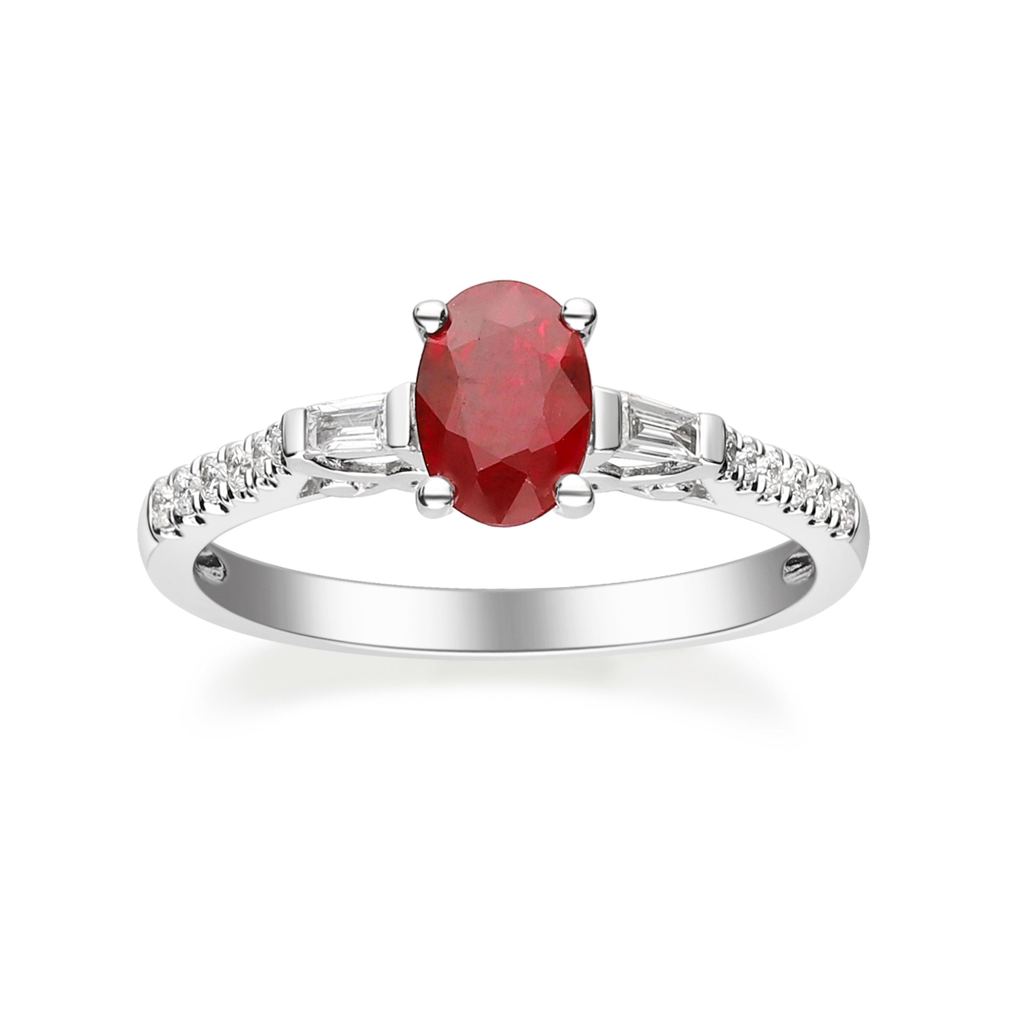 Decorate yourself in elegance with this Ring crafted from 14-karat White Gold by Gin & Grace. This Ring is made up of 7x5 mm Oval-Cut Mozambique Ruby (1 pcs) 0.97 carat and Round-cut White Diamond (14 Pcs) 0.10 Carat, Baguette-cut White Diamond (2 pcs) 0.08 carat. This Ring weighs 2.12 grams. This delicate Ring is polished to a high finish shine.