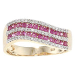 This beautiful ring showcases pairs of channel-set Round-cut Gin & Grace Genuine Mozambique Rubies that alternate with Natural diamond-studded bars. The ring iscrafted of beautiful 14-karat yellow gold in a highly polishedfinish. Gemstone colors: Pink Gemstone shapes: Round 24 channel-set Round-cut Genuine rubies each measure 1.5 mm wide x 1.5 mm long Total gemstone weight: 0.57 Diamonds: 60 Diamond cut: Natural Round Diamond measurements: 1 mm Diamond weight: 0.24 carat Color: G-H Clarity: I1-I2 Setting: Prong Metal: 14k yellow gold Finish: High polish Metal weight: 3.46 grams Ring setting dimensions: 19 mm wide x 6 mm long Band dimensions: 2 mm wide7