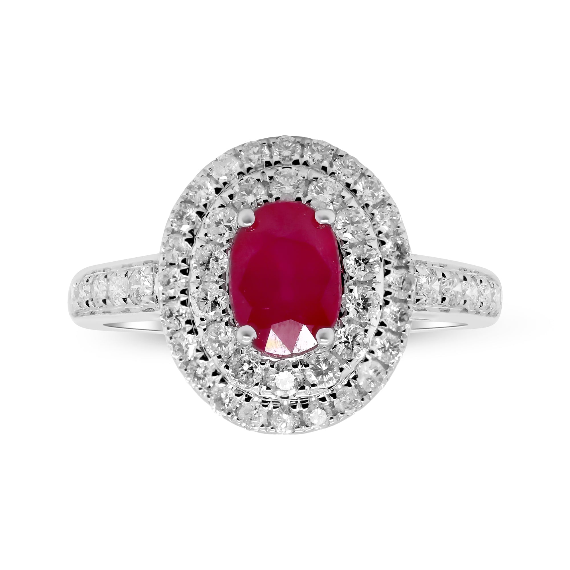 Decorate yourself in elegance with this Ring crafted from 14-karat white Gold by Gin & Grace. This Ring is made up of 5*7 mm Oval-Cut Mozambique Ruby (1 pcs) 1.23 carat and Round-cut Diamond (48 pcs) 0.65 Carat. This Ring weighs 2.88 grams. This delicate Ring is polished to a high finish shine.